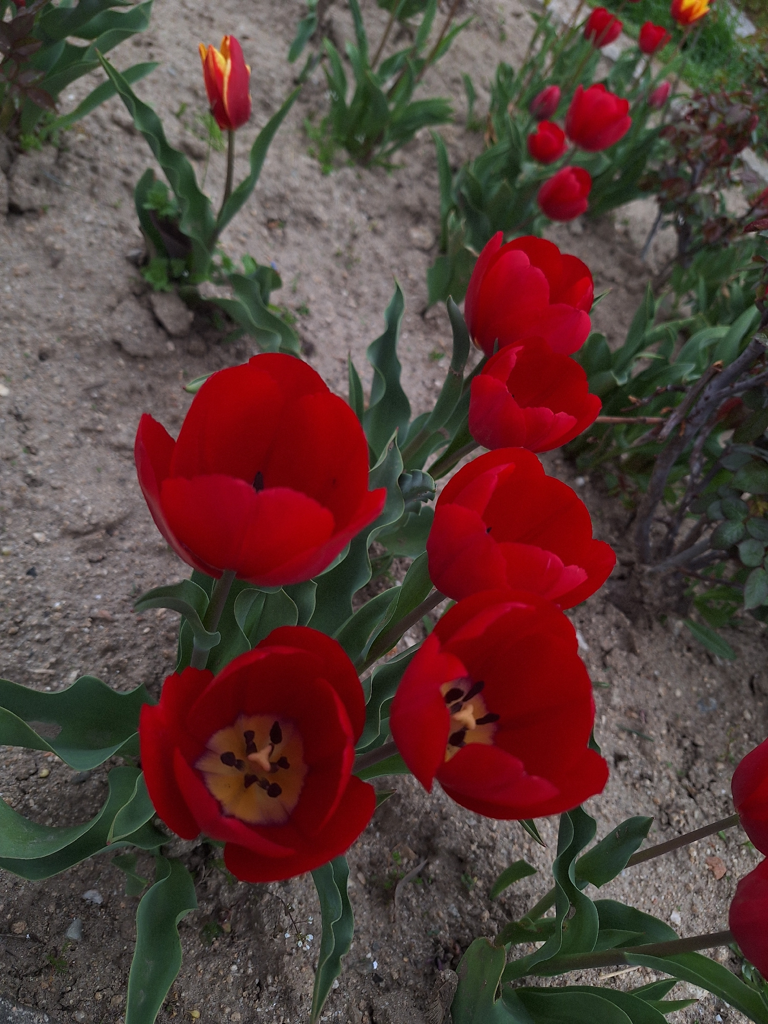 This media file captures a vibrant display of red tulips in a garden bed, likely taken during springtime in Panagyurishte, Bulgaria. The foreground is dominated by a cluster of several red tulips, som…read more