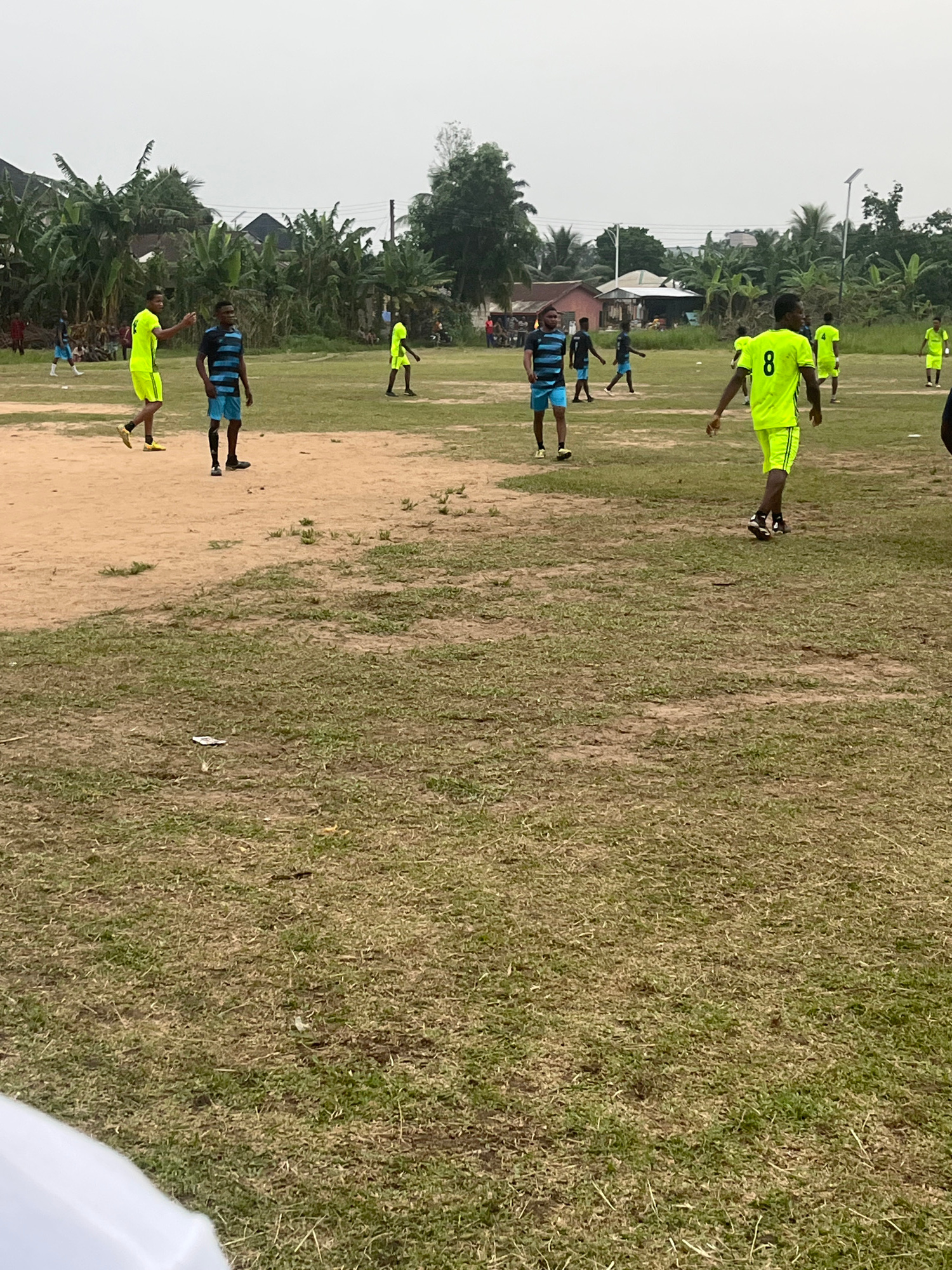 The image shows an outdoor soccer field in Ikot Ekpene, Nigeria. The field is composed of both grass and bare sandy areas. Several players, wearing bright yellow and blue-striped jerseys, are scattere…read more