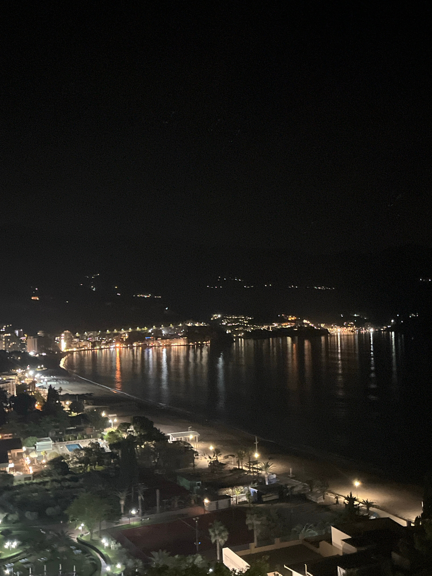 This is a factual description of the media file provided, depicting a panoramic nighttime view of a coastal area. The image captures a resort or town along a coastline at night, with the land on the…read more