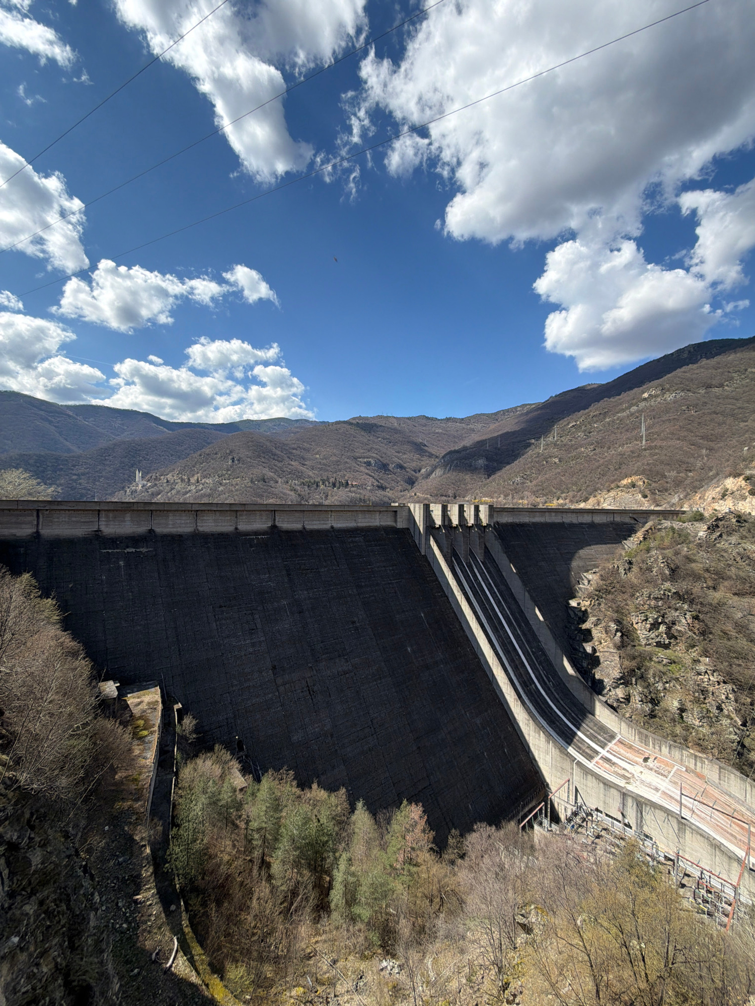 The image depicts a hydroelectric dam with a mountain on one side and a bright blue sky with fluffy white clouds on the other. The dam itself is tall and concrete, with several visible supports. A roa…read more