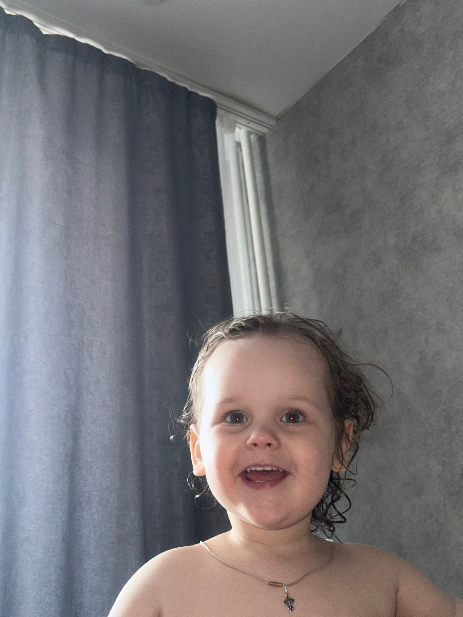 A young child is looking down at the camera. The child has wet hair and is wearing a necklace. In the background, there is a textured gray wall and a window with gray curtains. There is no information…read more