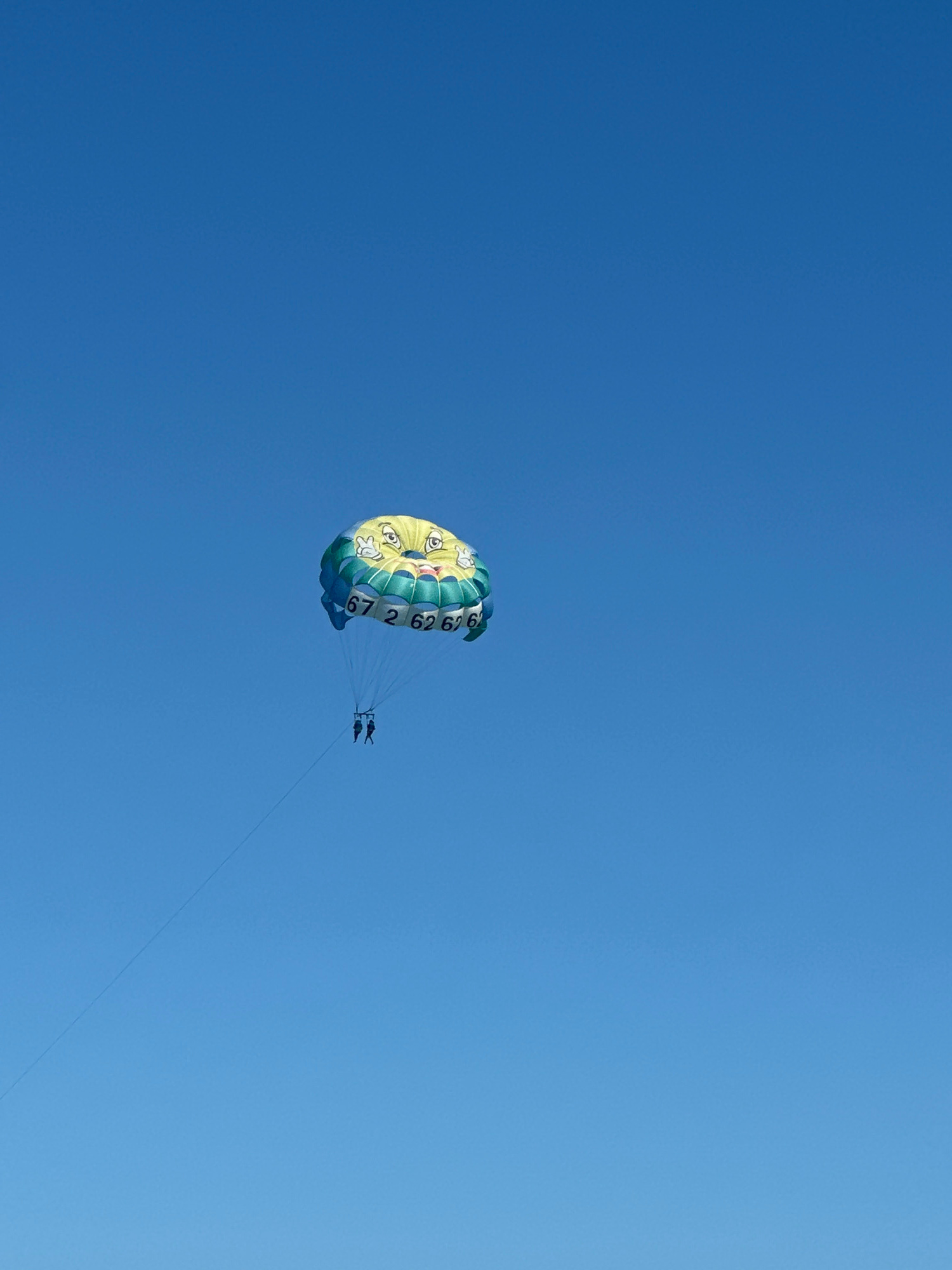 The image captures a parasailing activity against a clear blue sky. The parasail, featuring cartoon-like designs and the number "67262", is in the lower center of the frame. Two people are attached to…read more