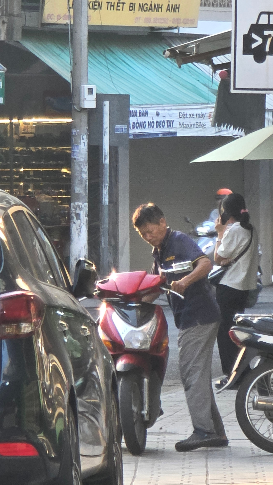 The image shows a street scene, seemingly in Nha Trang, Vietnam, as indicated by the signage in Vietnamese language. A man is positioned near a red and silver scooter, his stance suggesting he might b…read more