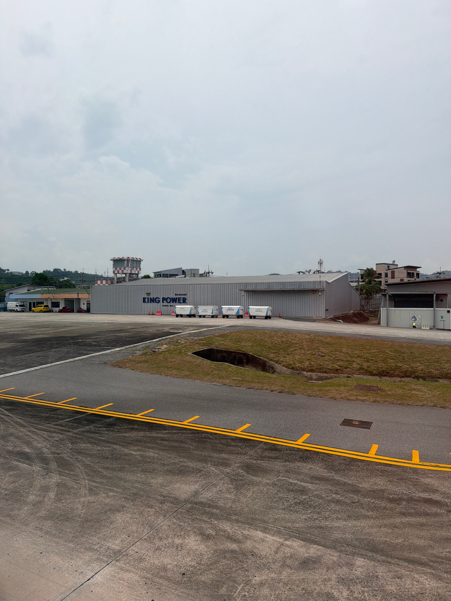 The image shows a view of the King Power building at Phuket International Airport in Mai Khao, Thailand. A portion of the runway is visible to the right of the building with yellow lane markings. The…read more