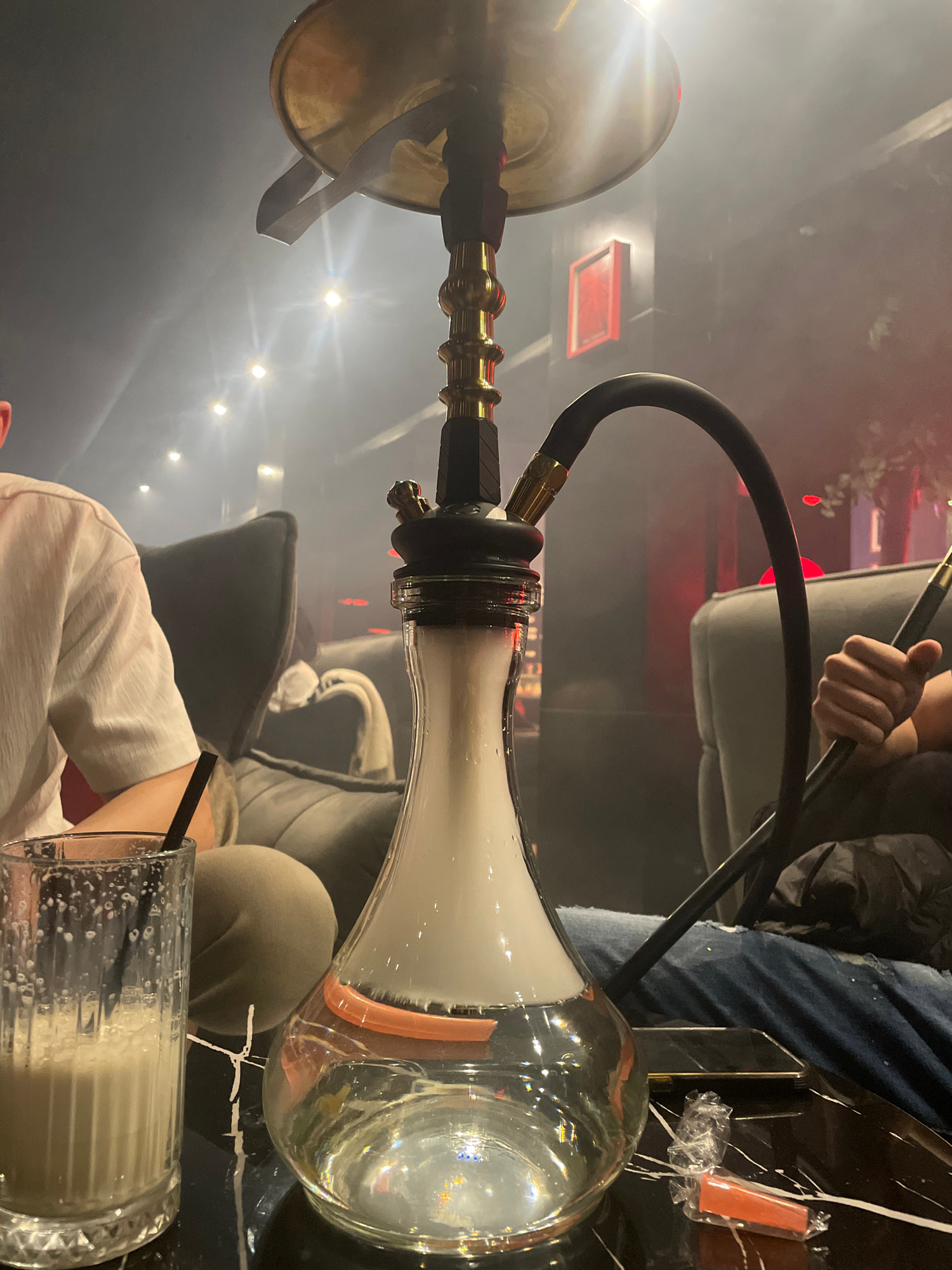The image captures a hookah setup on a dark, reflective surface, likely a table. The hookah has a brass top and a glass base filled with white smoke. A black hose connects the top to the base. In the…read more