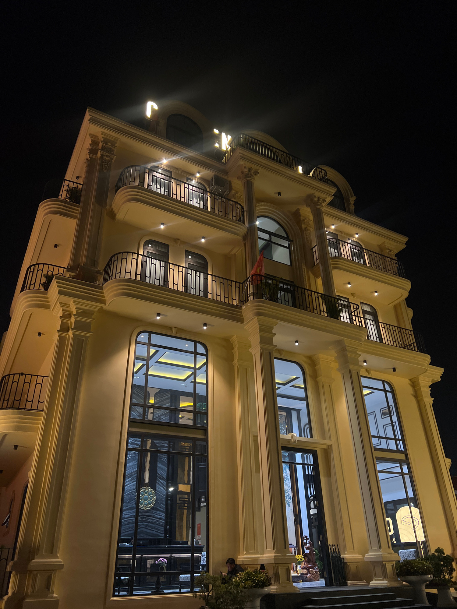 A low-angle photograph shows a multi-story building at night. The building has a pale yellow facade with arched windows and black wrought-iron balconies and fire escapes. The windows are lit from with…read more