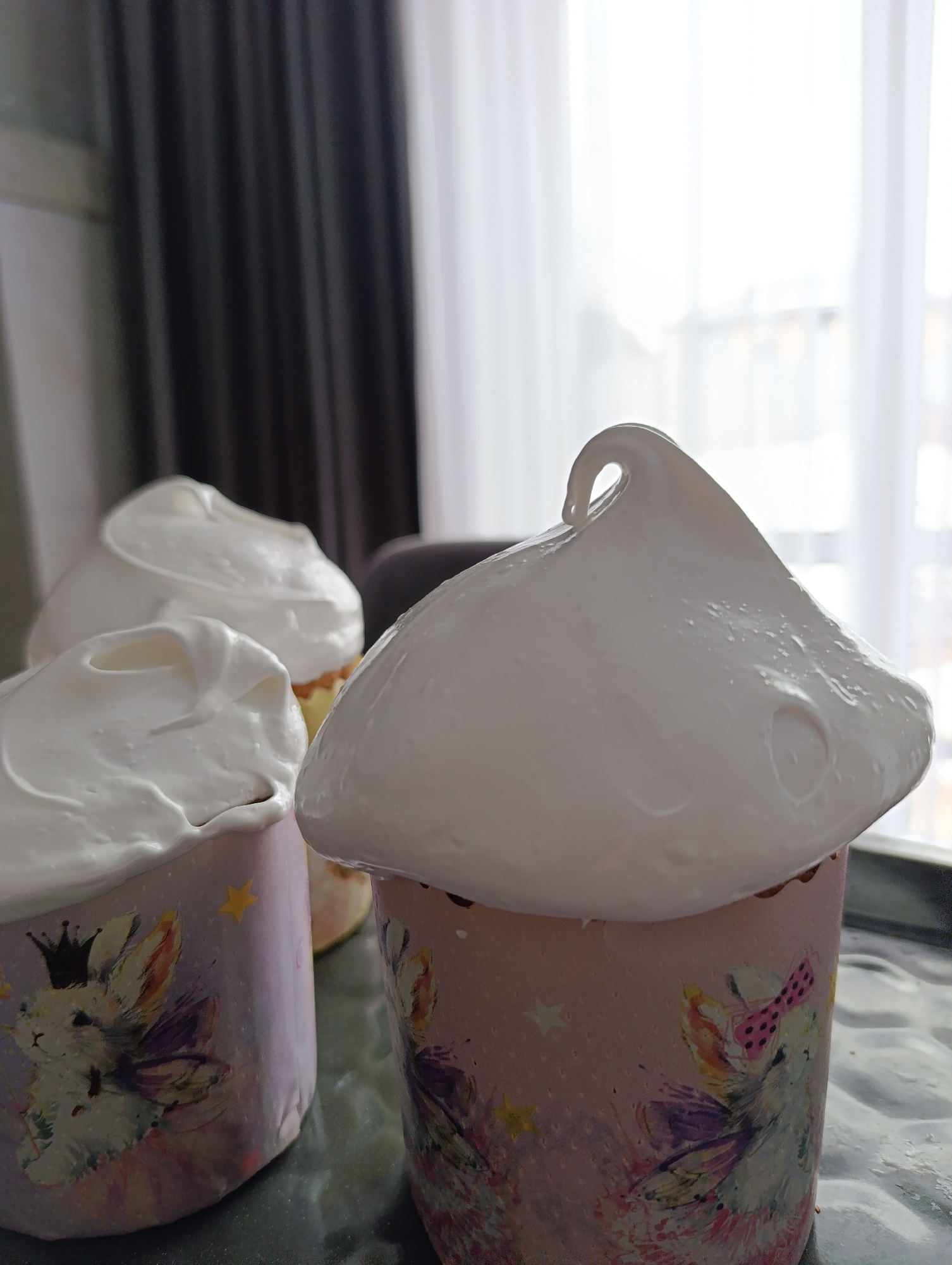 The image shows three Easter cakes on a dark, reflective surface. The cakes are in pink and purple paper wrappers decorated with drawings of bunnies. Each cake is topped with a generous amount of whit…read more