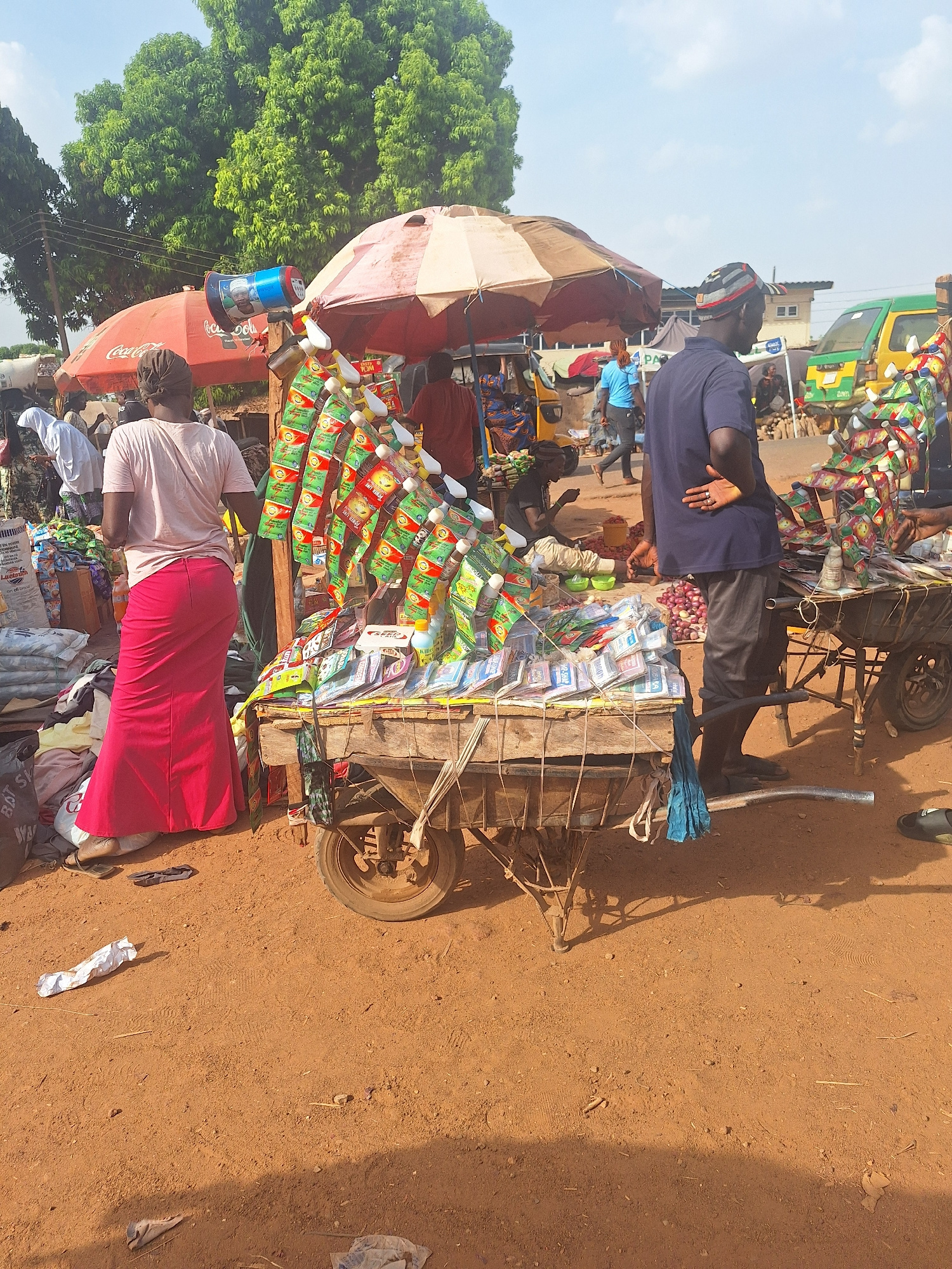 The image shows a street scene in Kakuri Gwari, Nigeria. A mobile vendor is operating from a three-wheeled cart, selling a variety of packaged goods, including condiments and household items. The cart…read more
