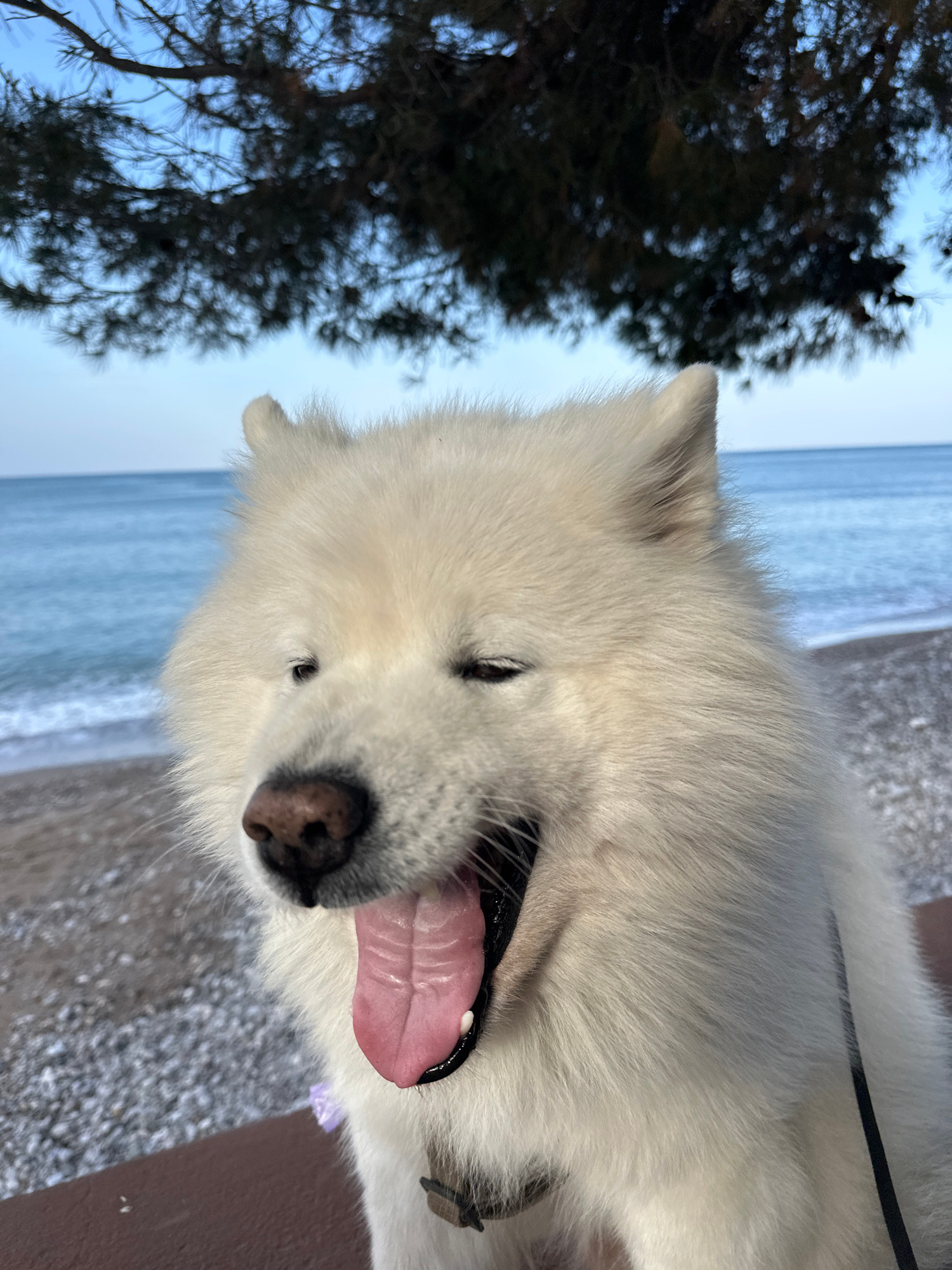 A white, fluffy dog, likely a Samoyed or similar breed, is prominently featured in a close-up, rotated ninety degrees counter-clockwise. The dog is positioned towards the center and right of the frame…read more