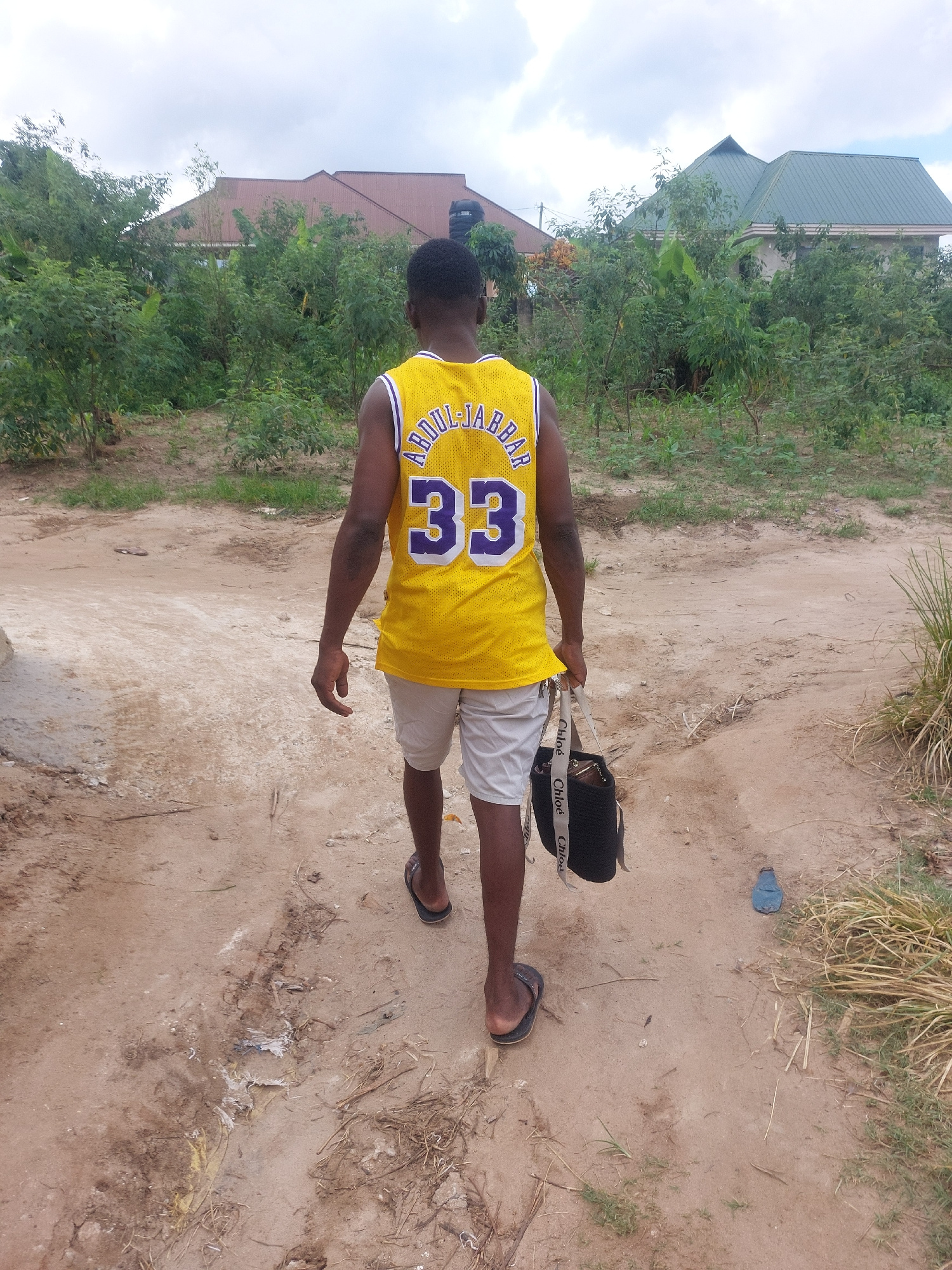 A person wearing a yellow basketball jersey with the name "ABDUL-JABBAR" and the number "33" on the back is standing on a dirt path. They are wearing light-colored shorts and sandals. The person is holding a black bag with white straps in their left hand. The path is surrounded by greenery, and there are buildings visible in the background. The exact location within Dar es-Salaam, Tanzania, is not discernible from the image. | Open Wire
