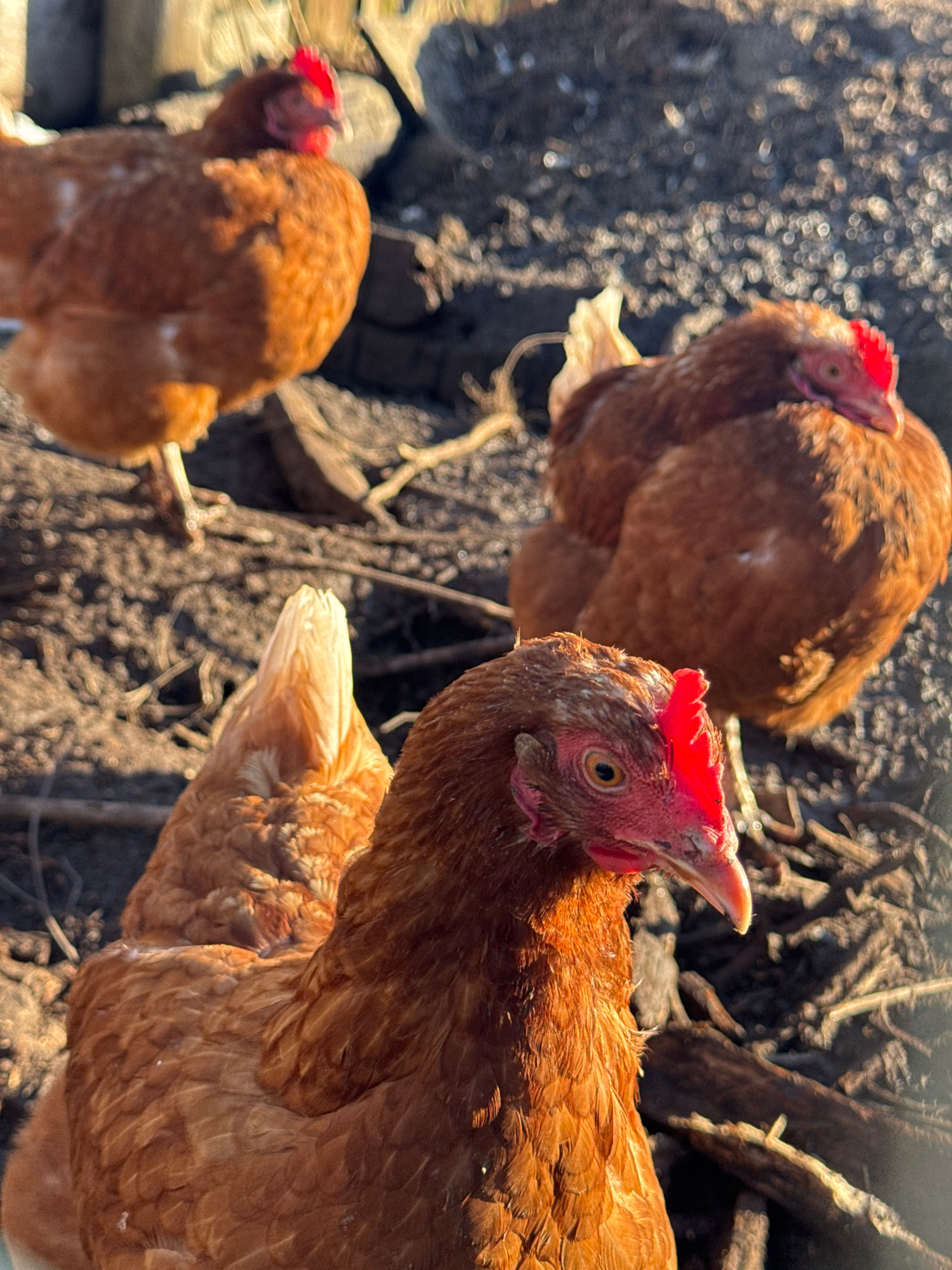 Three reddish-brown chickens are observed outdoors in the vicinity of organic material that appears to include wood and dirt. The closest chicken is in clear focus, while the other two chickens are sl…read more