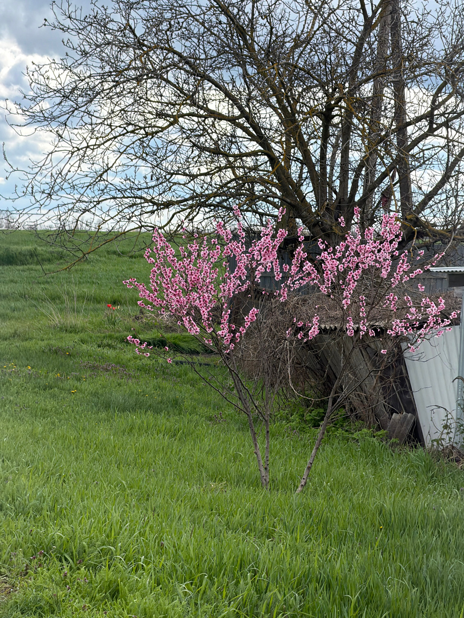 A landscape featuring a large tree with bare branches in the upper left, transitioning into a smaller tree adorned with pink blossoms. Green grass covers the ground. A building structure is visible be…read more