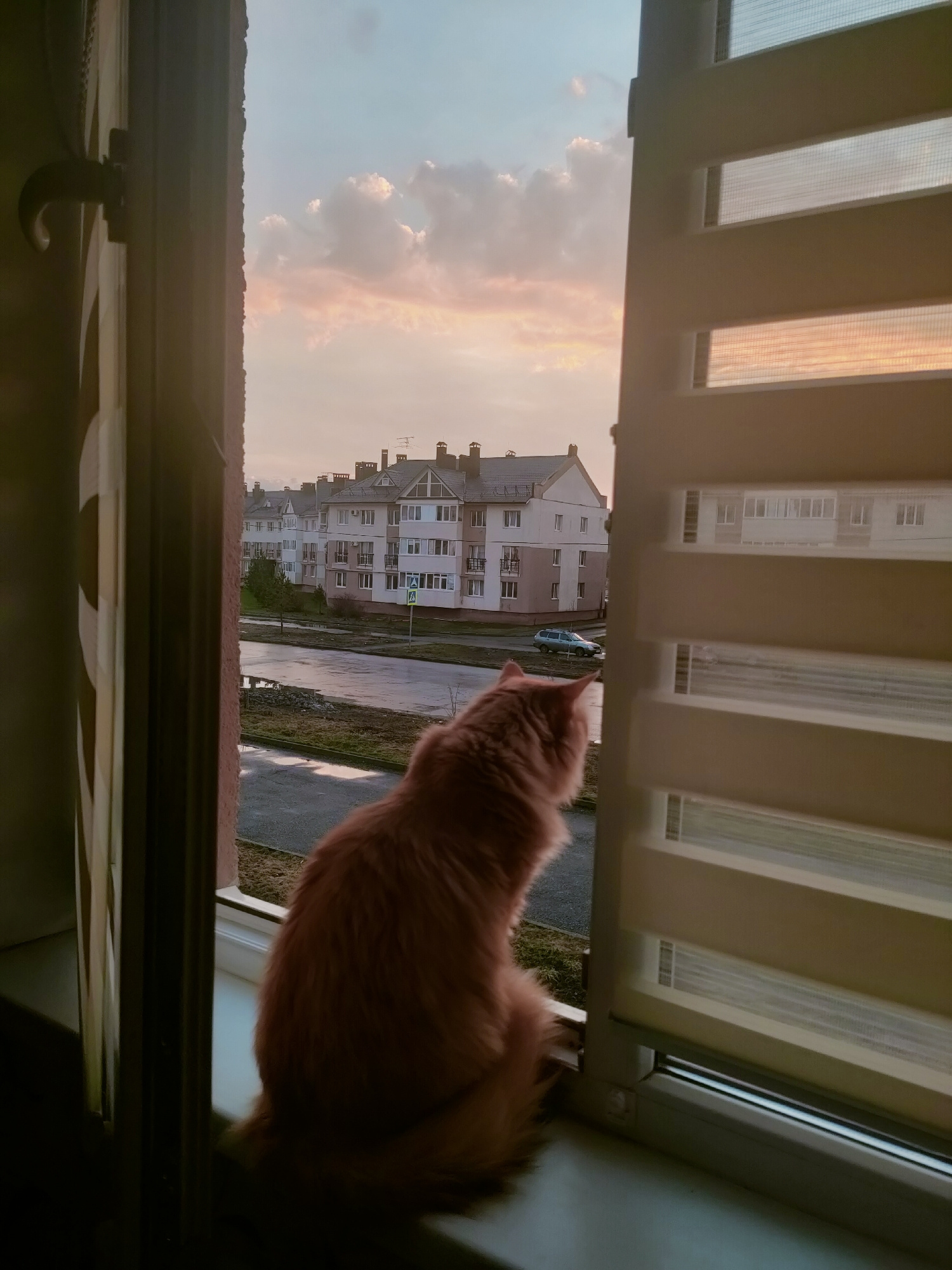 An orange cat sits on a white windowsill, looking out of an open window. The window is partially obscured by open blinds. Beyond the window is a street scene in Ufa, Russia, with multi-story residenti…read more