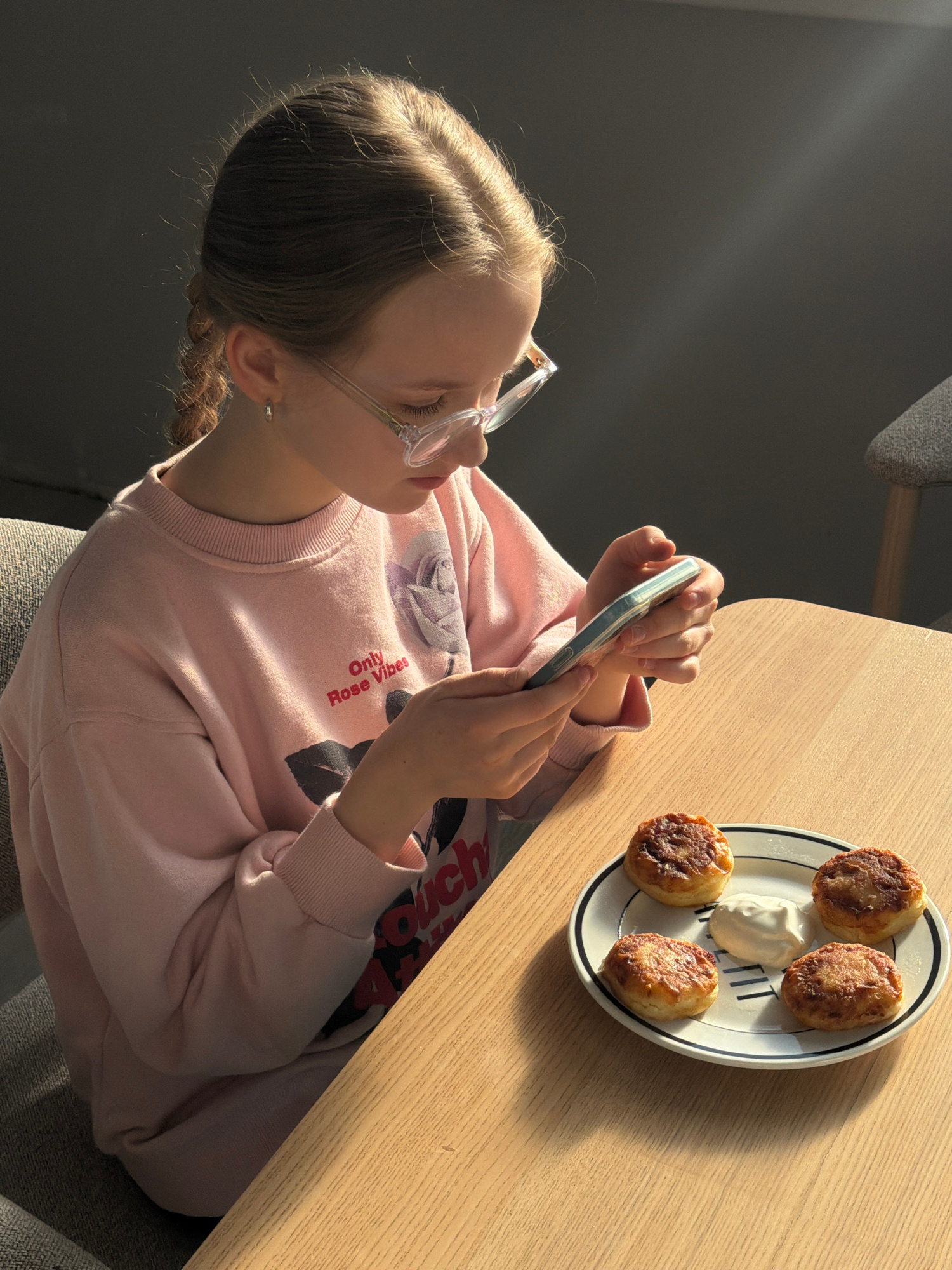 A girl with braided hair and glasses is seated at a light-colored wooden table, looking at a smartphone she holds in her hands. She is wearing a pink sweatshirt with a floral design and the words "Onl…read more