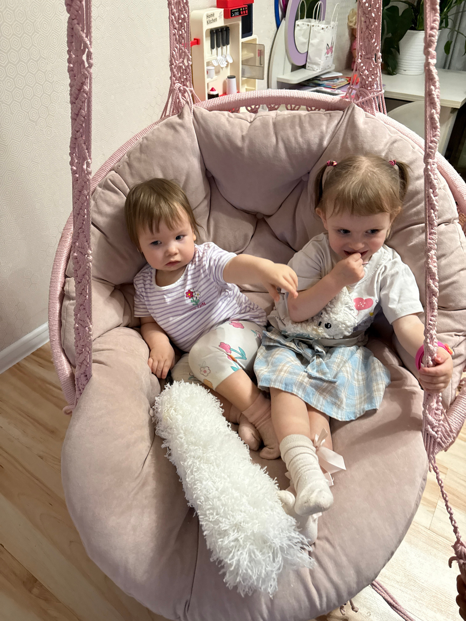 Two young children are lying together in a hanging chair. The chair is round, cushioned, and light pink, suspended by a woven pink cord. The girl on top has blonde hair in pigtails, wearing a white t-…read more