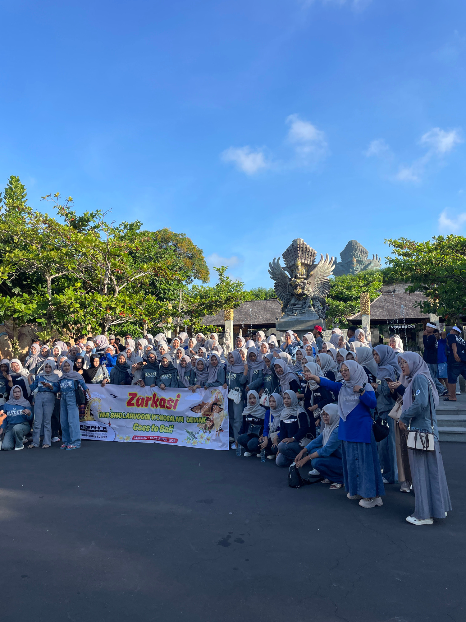A large group of people, mostly women wearing hijabs, are standing in a formation and posing for a photograph in front of a statue in Kuta Selatan, Indonesia. They are holding a banner that reads "Zarβ¦read more