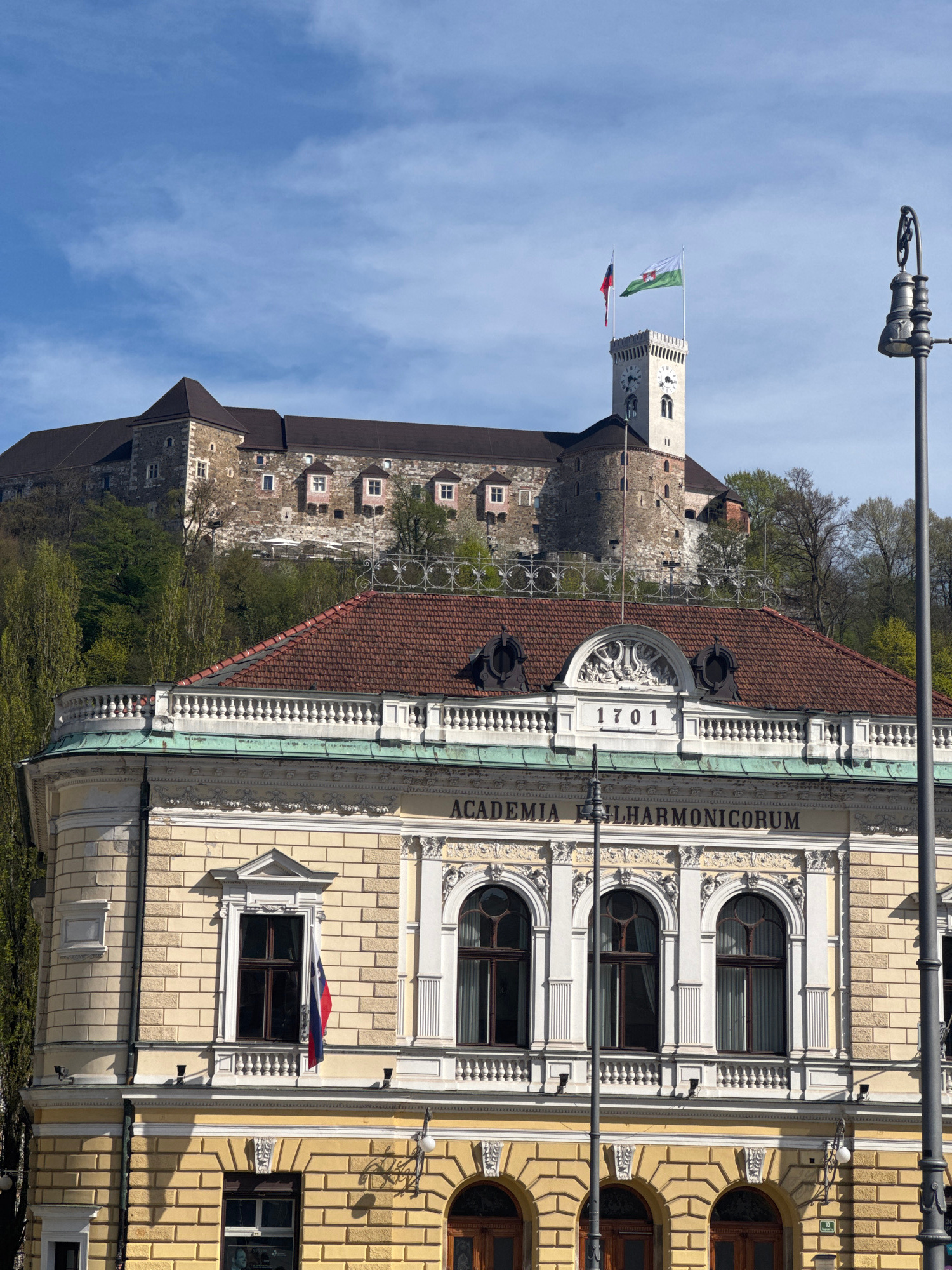 The image shows two buildings in Ljubljana, Slovenia. On the left is Ljubljana Castle, a medieval castle on a hill, with a tower displaying two flags. The castle is constructed of stone with a red til…read more