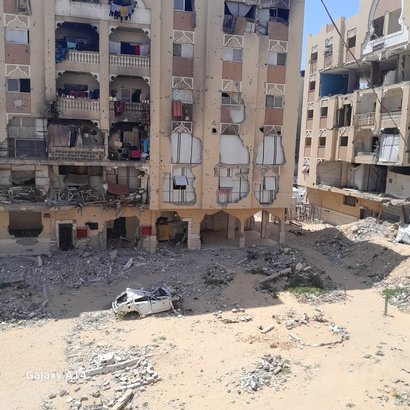 The image depicts severe destruction in a building in Khan Yunis, Palestinian Territory. The building's facade is heavily damaged with missing walls, windows, and structural elements. Debris and rubbl…read more