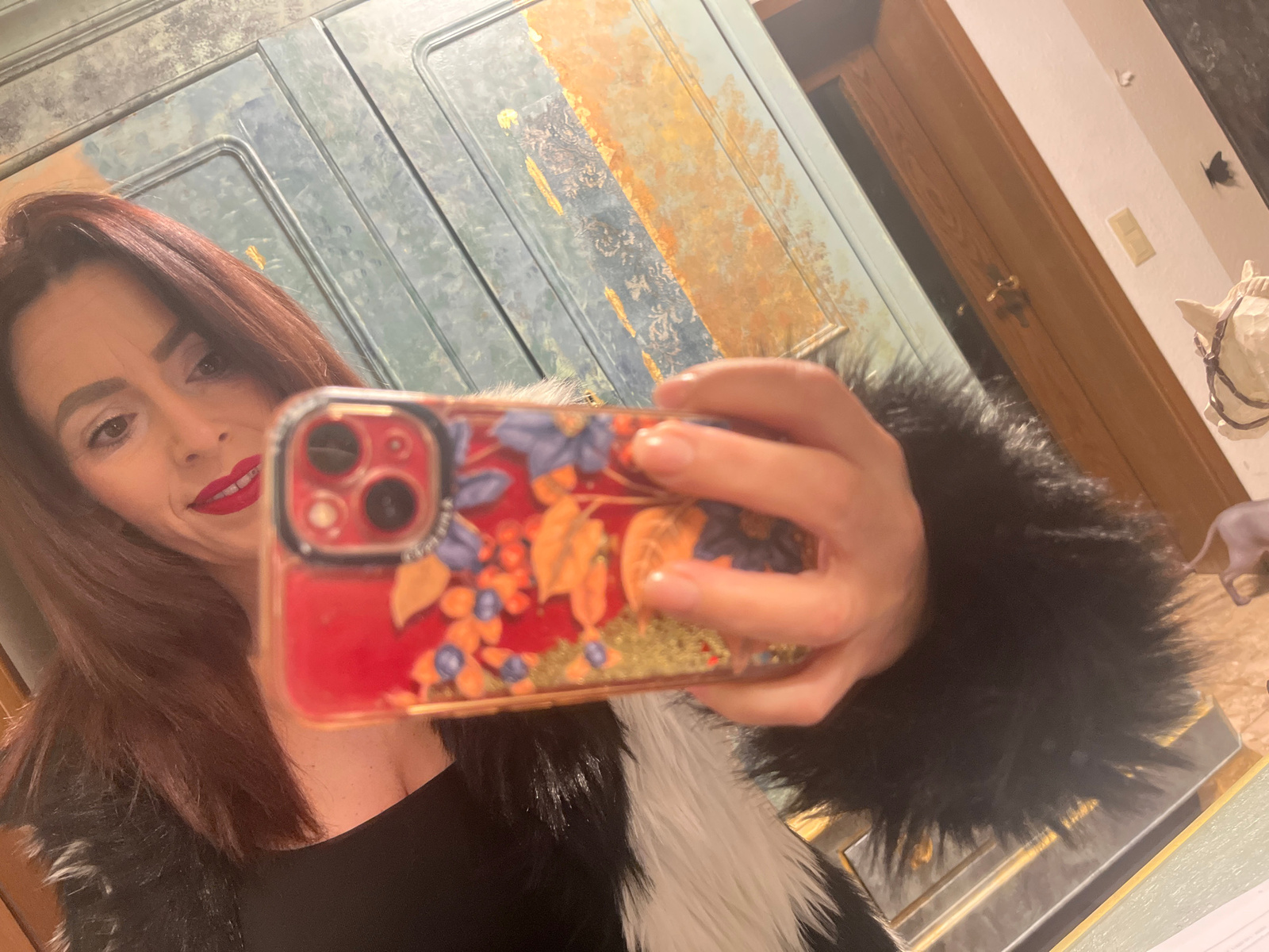 A medium shot shows a woman with auburn hair and red lipstick taking a selfie in front of a mirrored surface, likely a cupboard or wall cabinet. She holds up a red iPhone with a floral design case to…read more