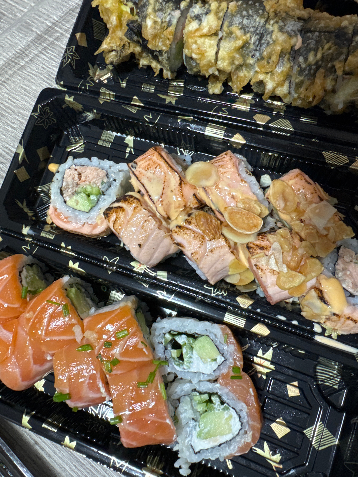 The image shows three black plastic containers filled with sushi. The leftmost container holds sushi with salmon on top, garnished with green chives, and inside each roll is cream cheese and cucumber.…read more
