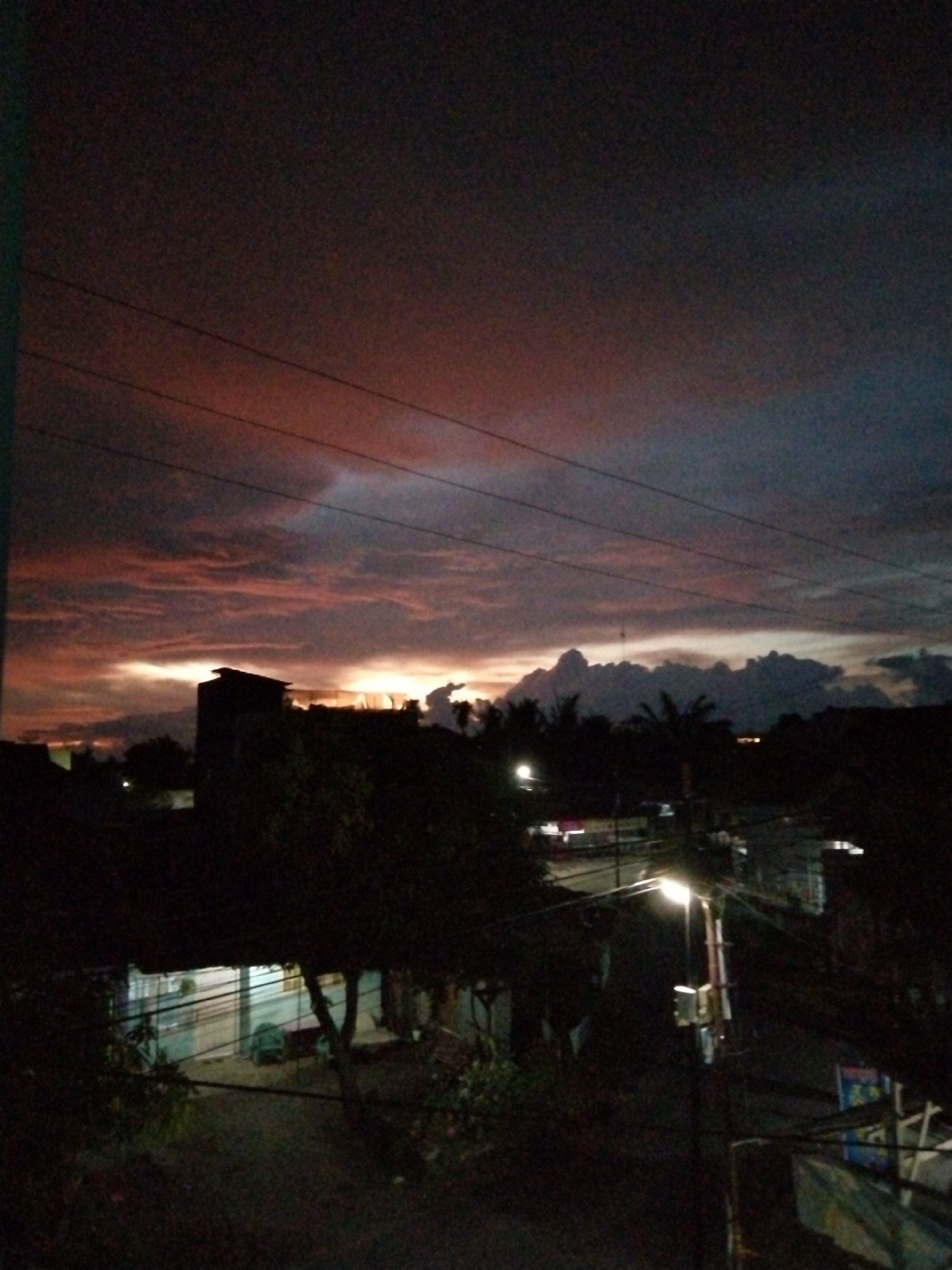The image shows a night scene in Bireuenmeunasahdayah, Indonesia. The sky exhibits a gradient of color from a deep, dark red-tinged mauve to an inky black, indicating either a late sunset or early sun…read more