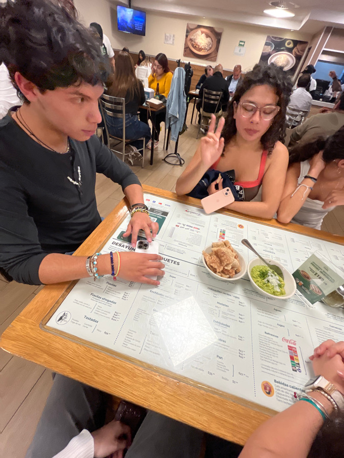 A group gathers around a restaurant table covered in a menu. A young woman with glasses flashes a peace sign while another leans in. On the table, there are dishes of guacamole and chicharrones. A you…read more