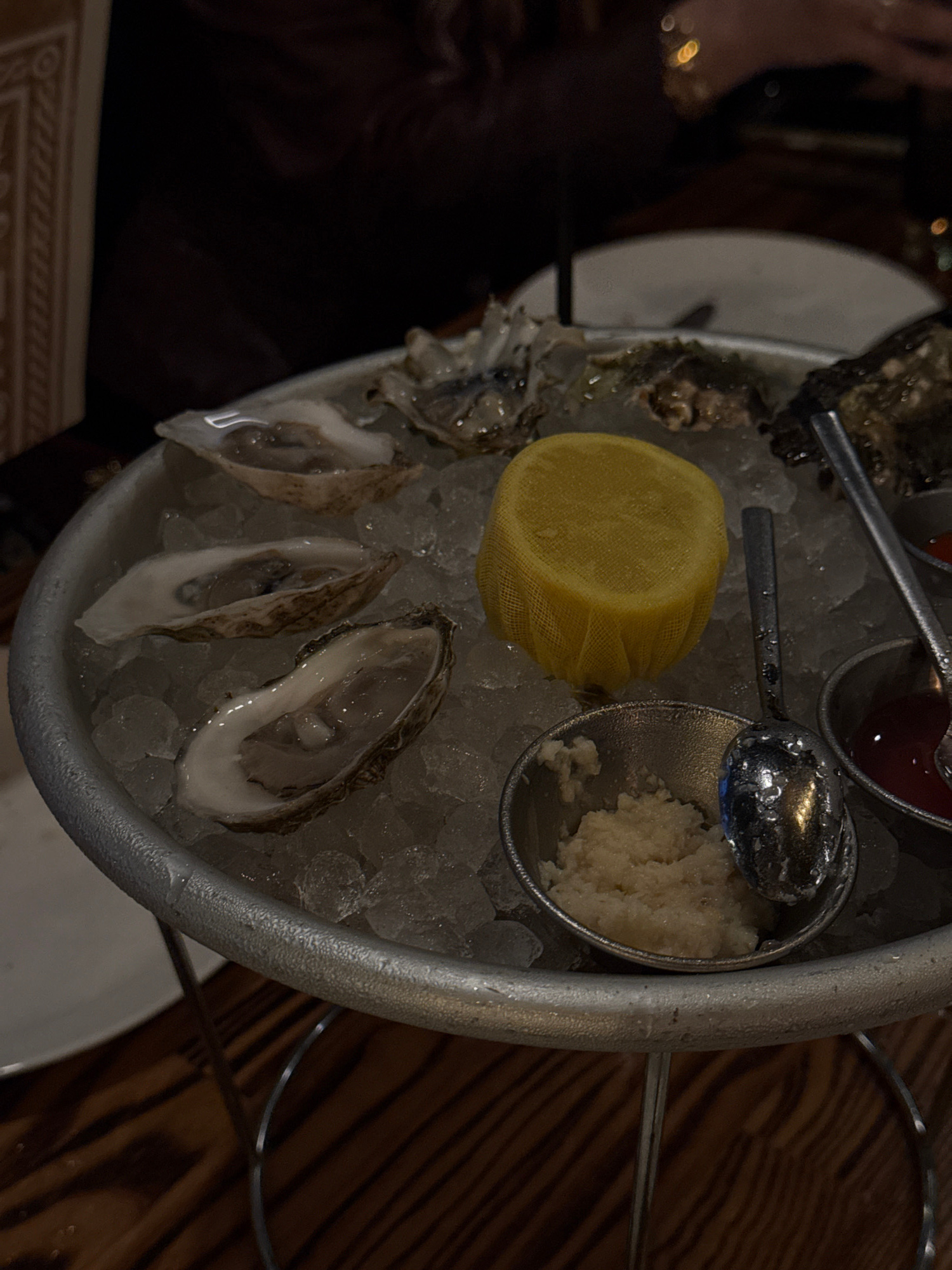 A slightly elevated, top-down, angled shot depicts an ice-filled, round, metal oyster platter with oysters, a lemon wedge in netting, horseradish, and cocktail sauce, situated in a dimly lit restauran…read more