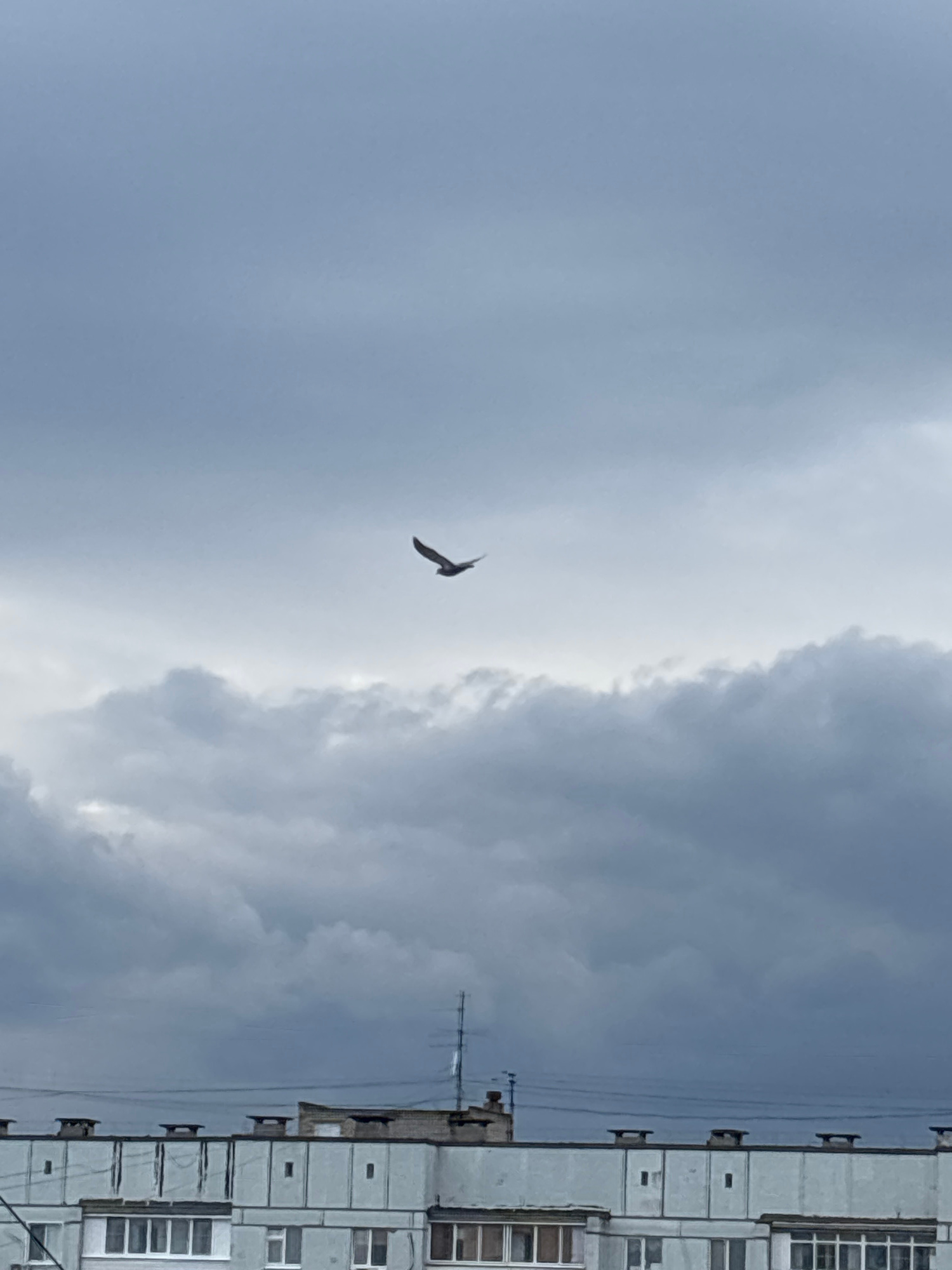 The image depicts a bird flying in a cloudy sky above a building. The building appears to be a multi-story residential building with repetitive window patterns, typical of Soviet-era architecture. The…read more