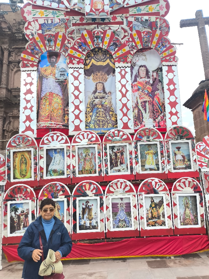 A woman stands in front of a religious display. The large structure is adorned with multiple images of religious figures, including a man holding a building, a Madonna and child, and a woman in ornate…read more