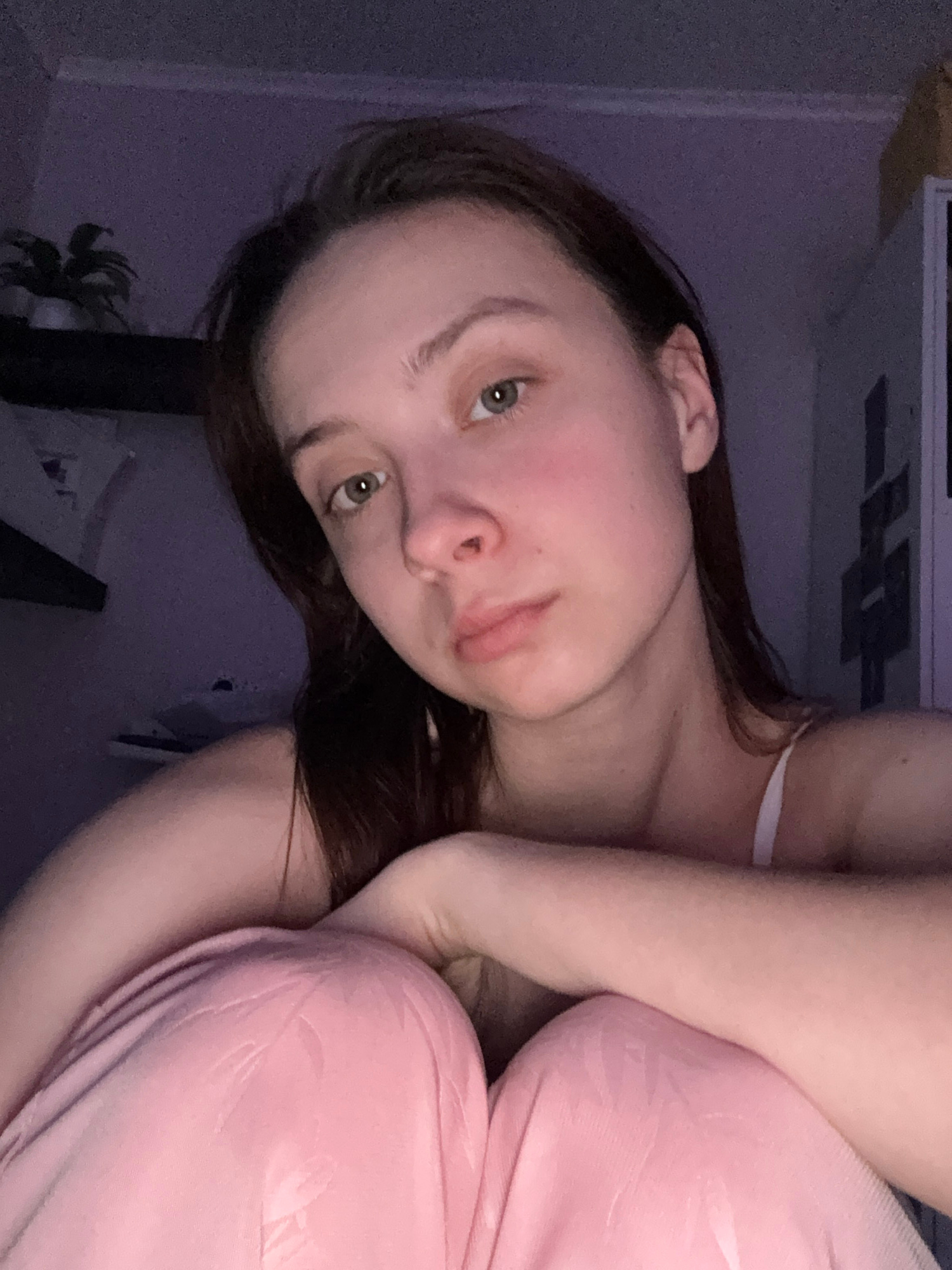A young woman with brown hair and green eyes is photographed indoors in a dimly lit room. She's wearing a white tank top and light pink patterned pajama pants, hugging her knees close to her chest. Th…read more
