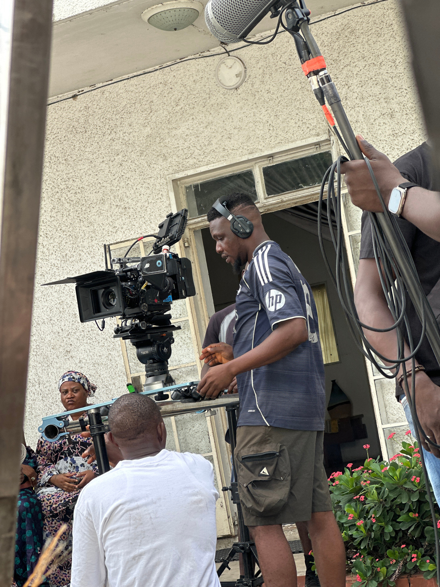 The image depicts a film or video production scene likely taking place outdoors in Lagos, Nigeria. A professional video camera is prominently positioned on a dolly, and is being operated by a camerama…read more