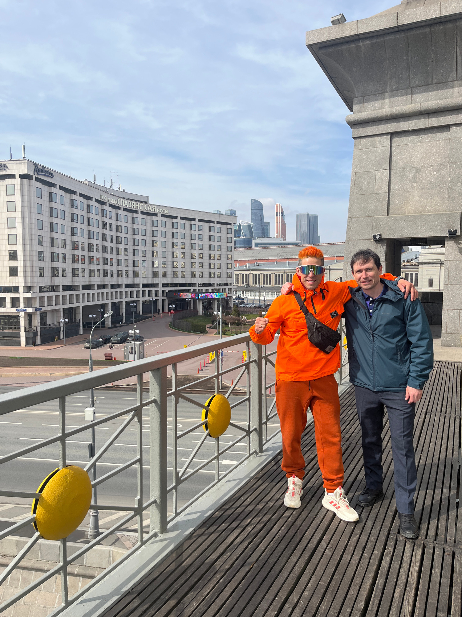 Two men are posing on a walkway with a grey railing in front of a building, with a partial view of the Moscow cityscape in the background. One man is wearing an orange jacket and pants with white snea…read more