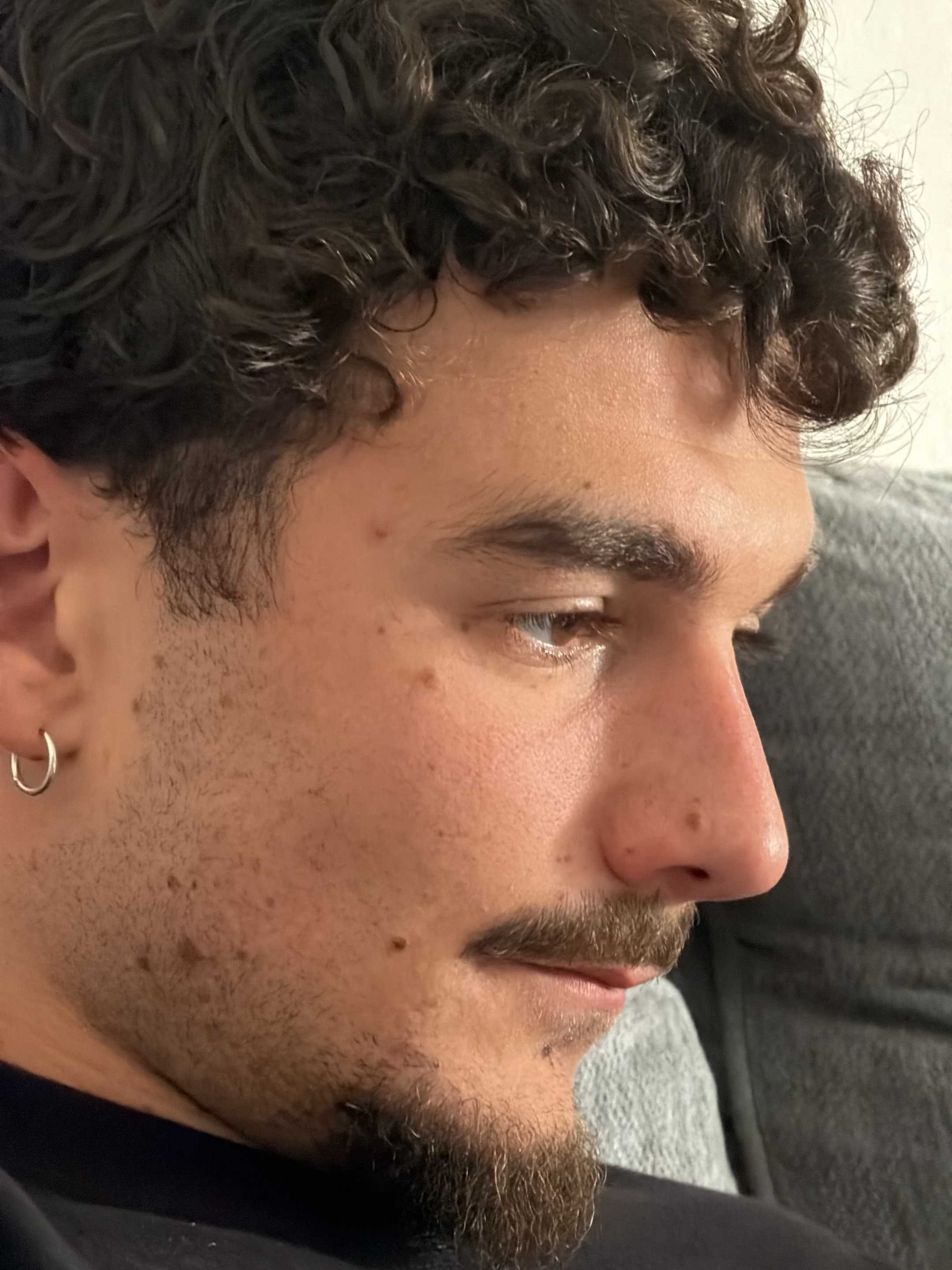 A close-up, profile image features a man with medium brown, curly hair and a neatly trimmed mustache and goatee. He is positioned towards the left of the frame, looking downwards and slightly to the r…read more