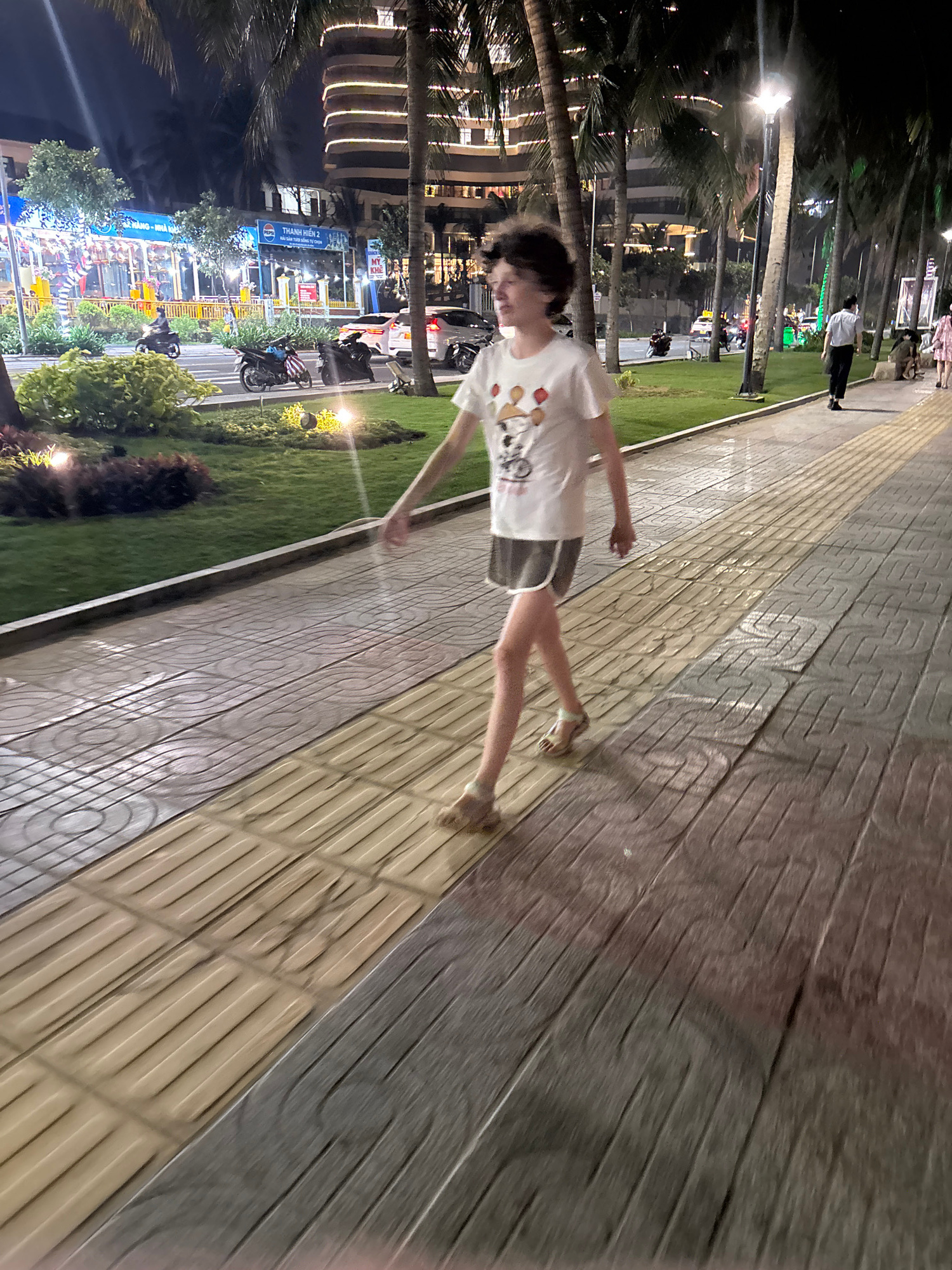 A young person wearing a white t-shirt with cartoon graphics and gray shorts is walking on a two-toned paved sidewalk next to a strip of grass, seemingly at night. The lighting is mixed with artificia…read more