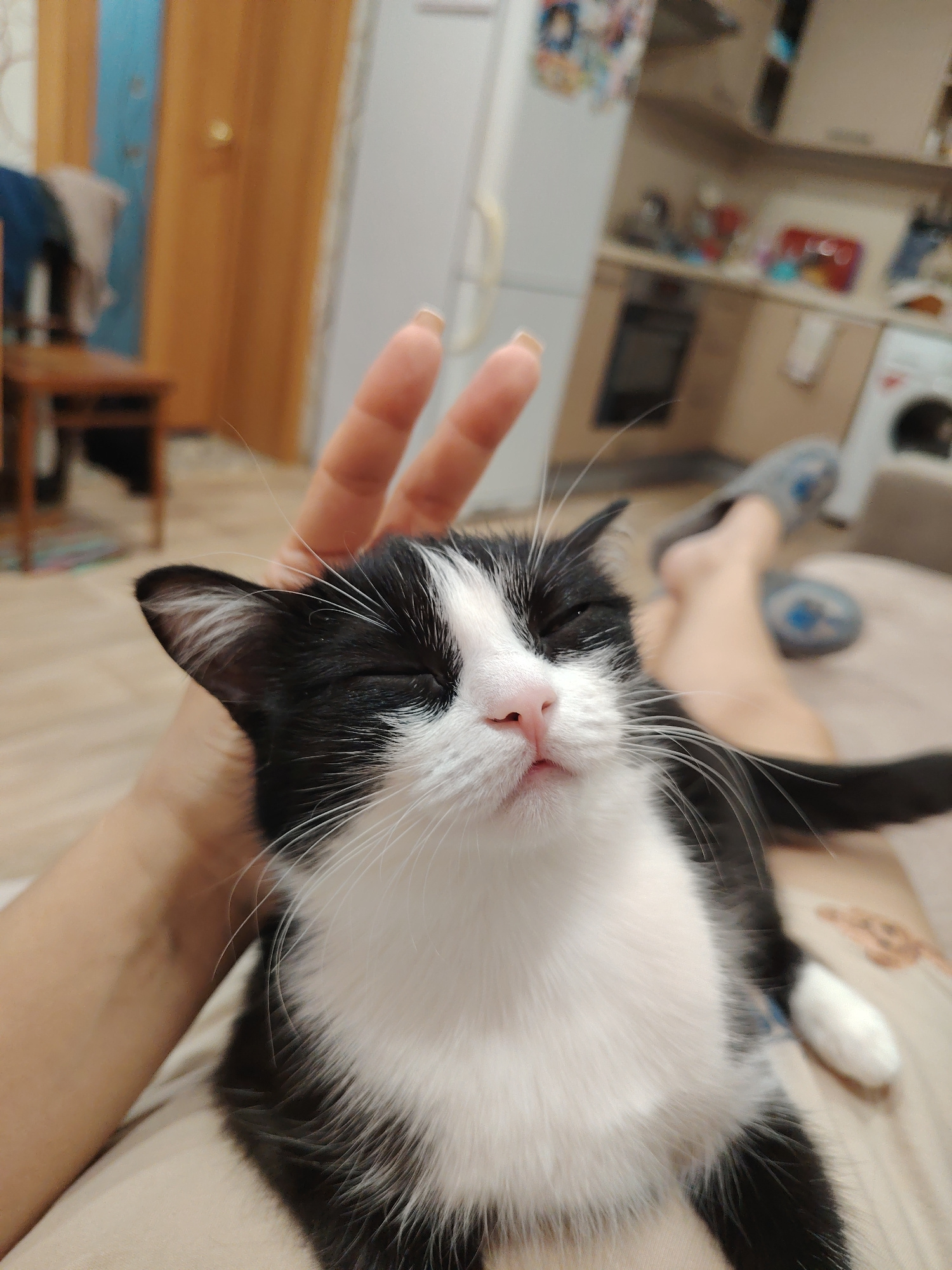 A medium, eye-level shot depicts a black and white cat being petted by a human hand. The cat has its eyes closed, a pink nose, and long white whiskers. The human's hand is visible above the cat's head…read more