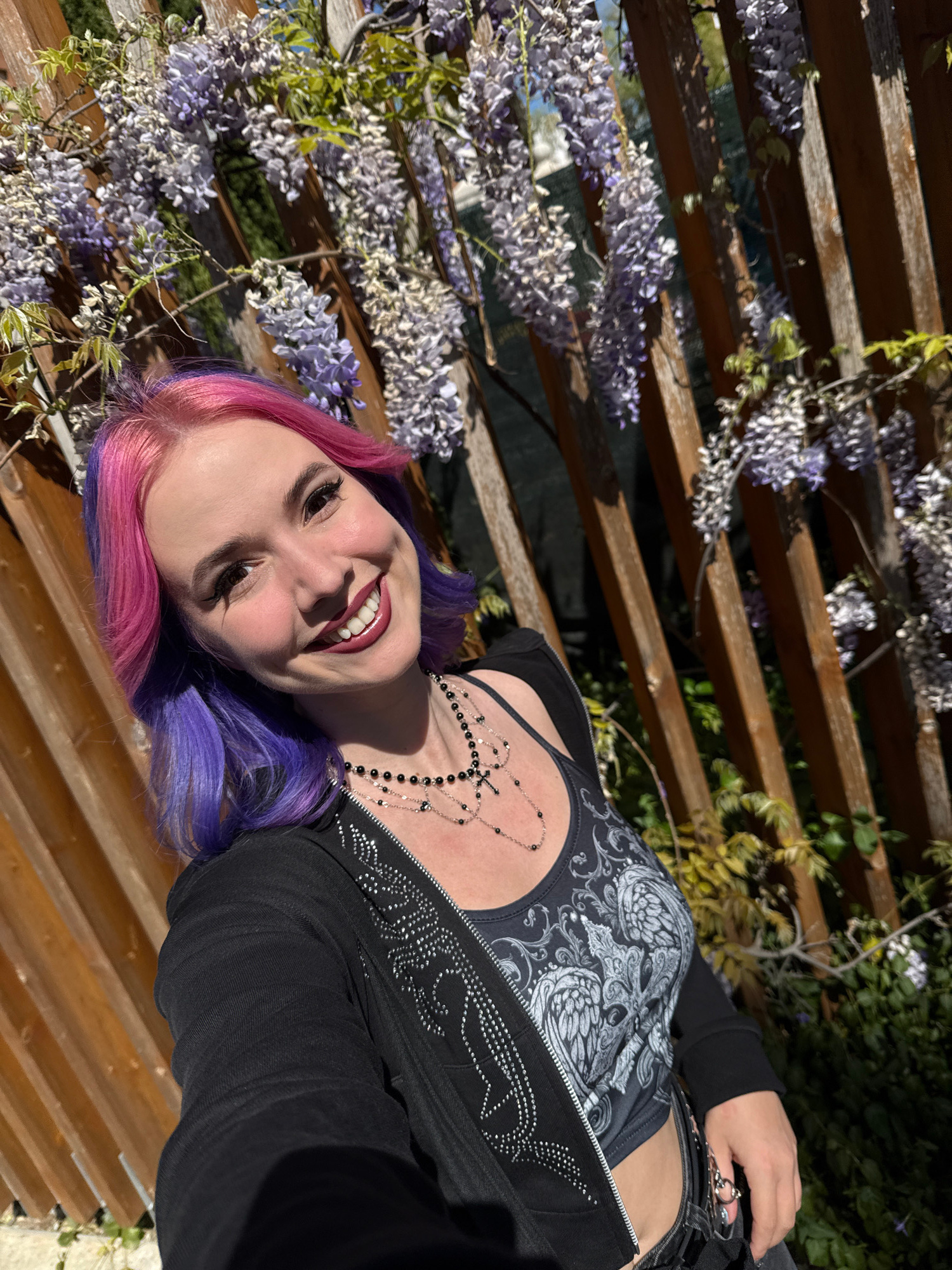 A fair-skinned young adult woman with pink and purple hair is seen in a slightly tilted medium shot. She is smiling and looking directly at the camera. She is wearing a black tank top with a grey pais…read more