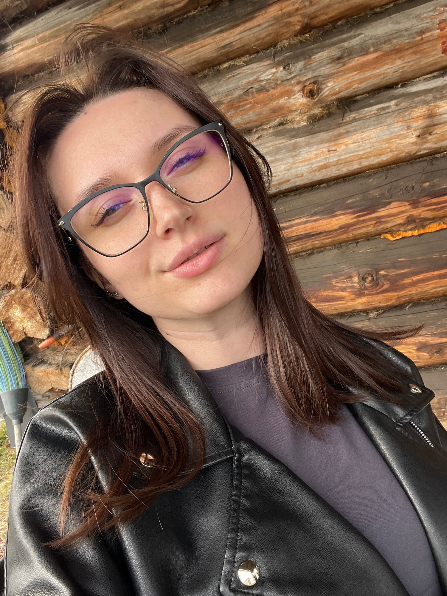 The image shows a woman wearing black-rimmed glasses and a black leather jacket. She is lying down, with her head tilted to the side. The background consists of rough wooden planks. The image location…read more