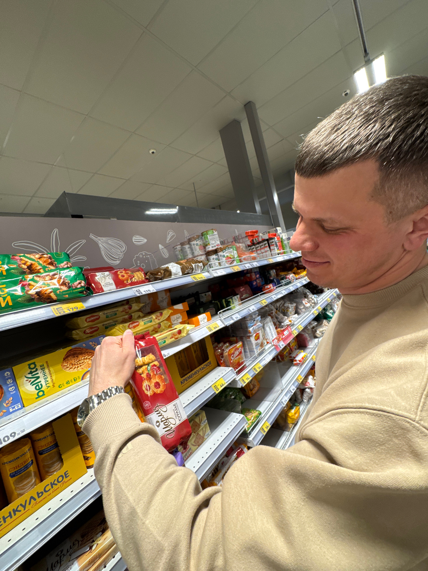 A man is seen selecting a package of "Mариз" cookies from a refrigerated display case, possibly in a store in the city of Горный, Russia. The case is filled with various food products including cookie…read more