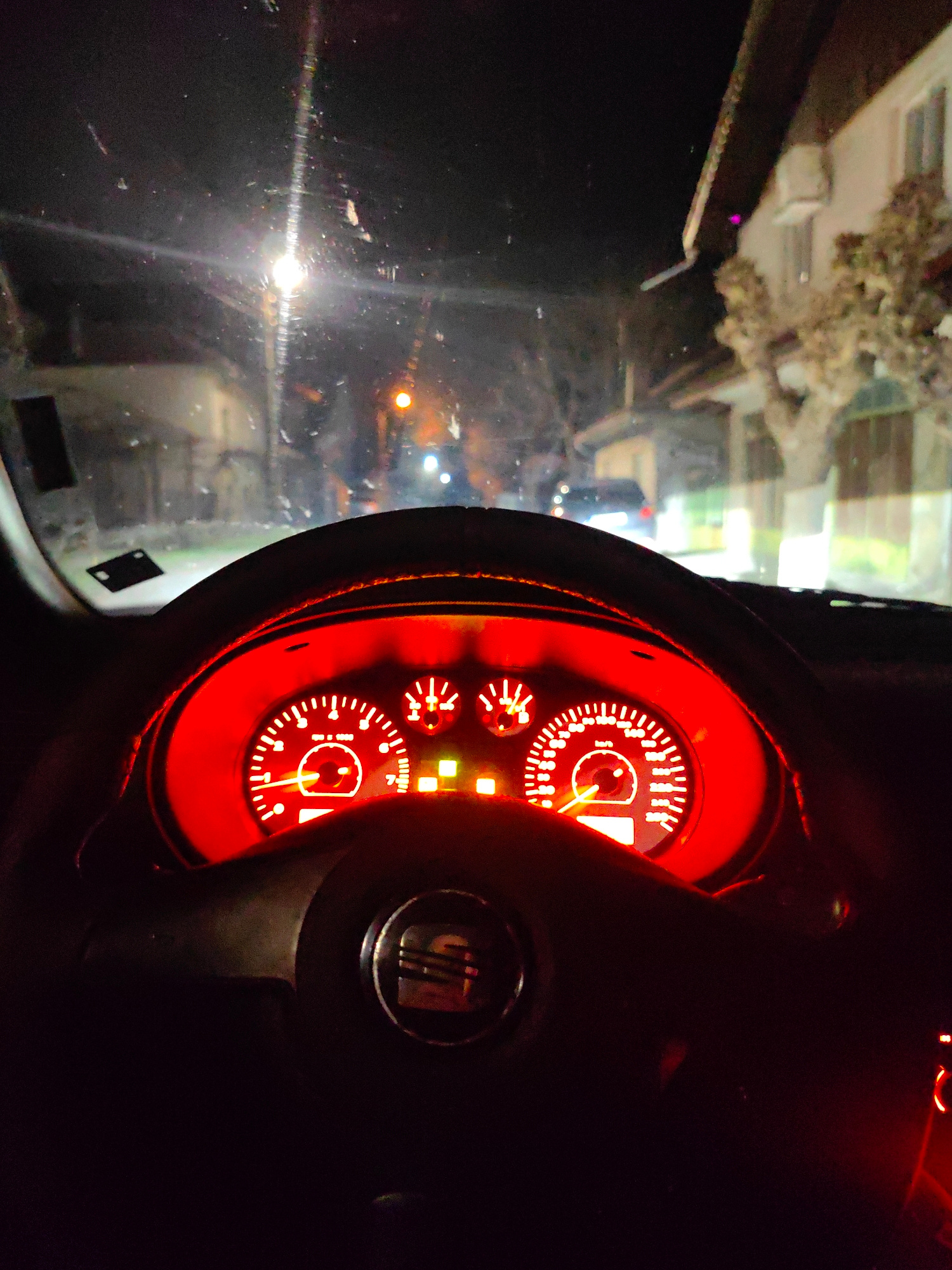 The image shows the interior of a car, specifically the dashboard and steering wheel, at night. The instrument panel is illuminated in red. The speedometer indicates a speed around 70 km/h. Outside thβ¦read more