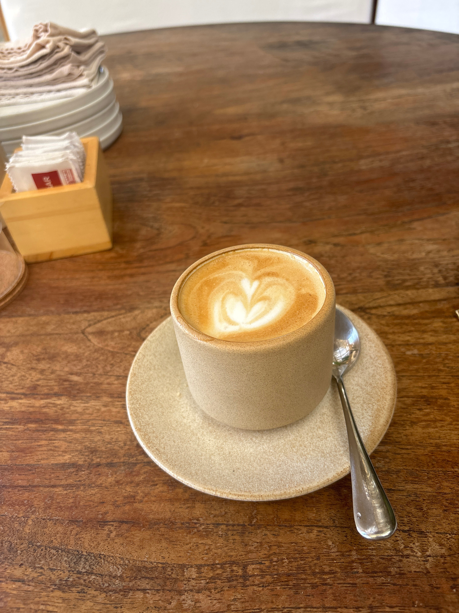 A tan ceramic coffee cup with latte art sits on a matching saucer, accompanied by a silver spoon. The cup and saucer are placed on a wooden table. Next to the cup are a stack of paper napkins and a sm…read more