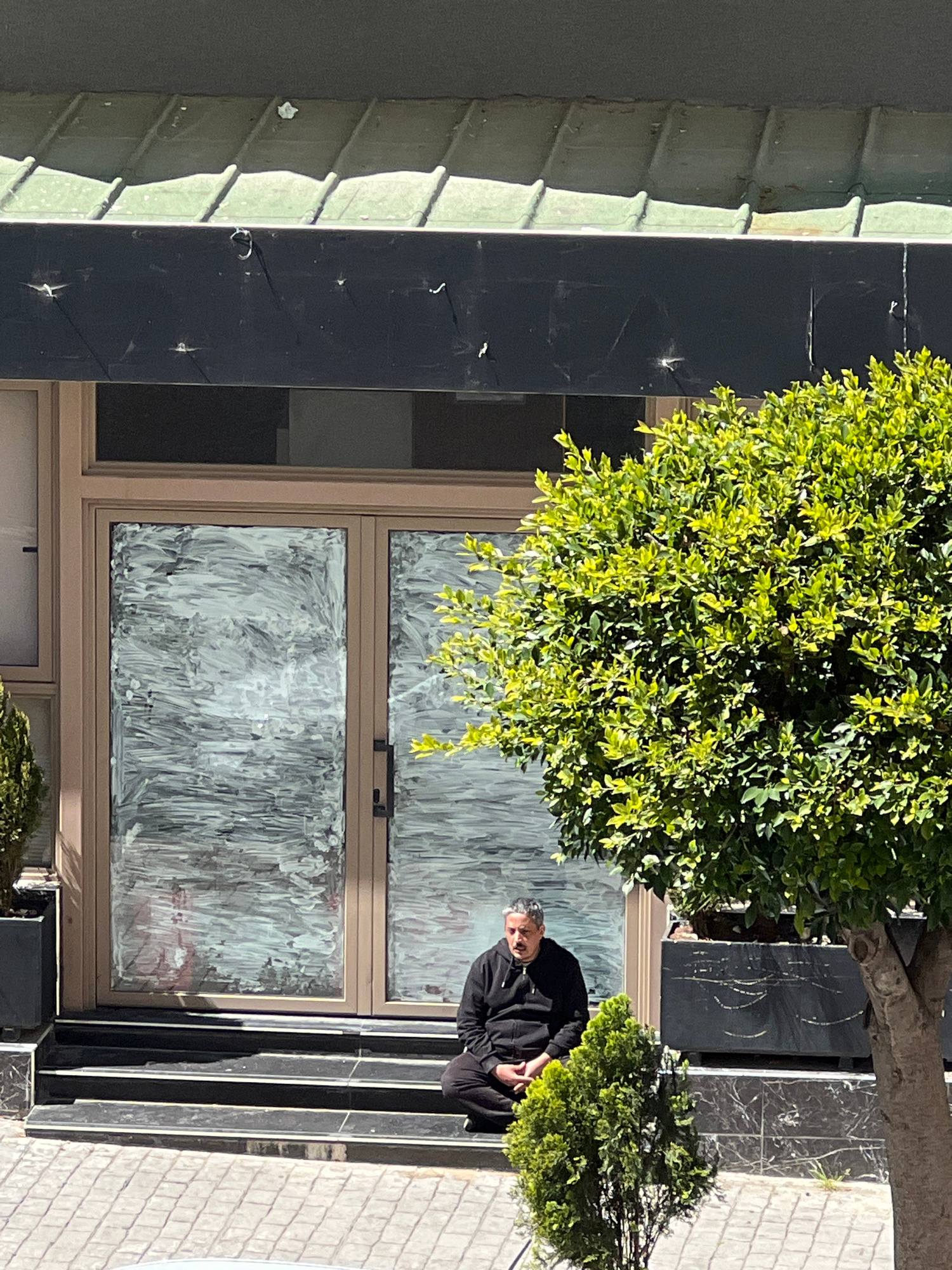 A man in a black jacket stands in front of a building with windows that are covered with white paint. The building has black trim and green siding. There are two trees in front of the building, one la…read more