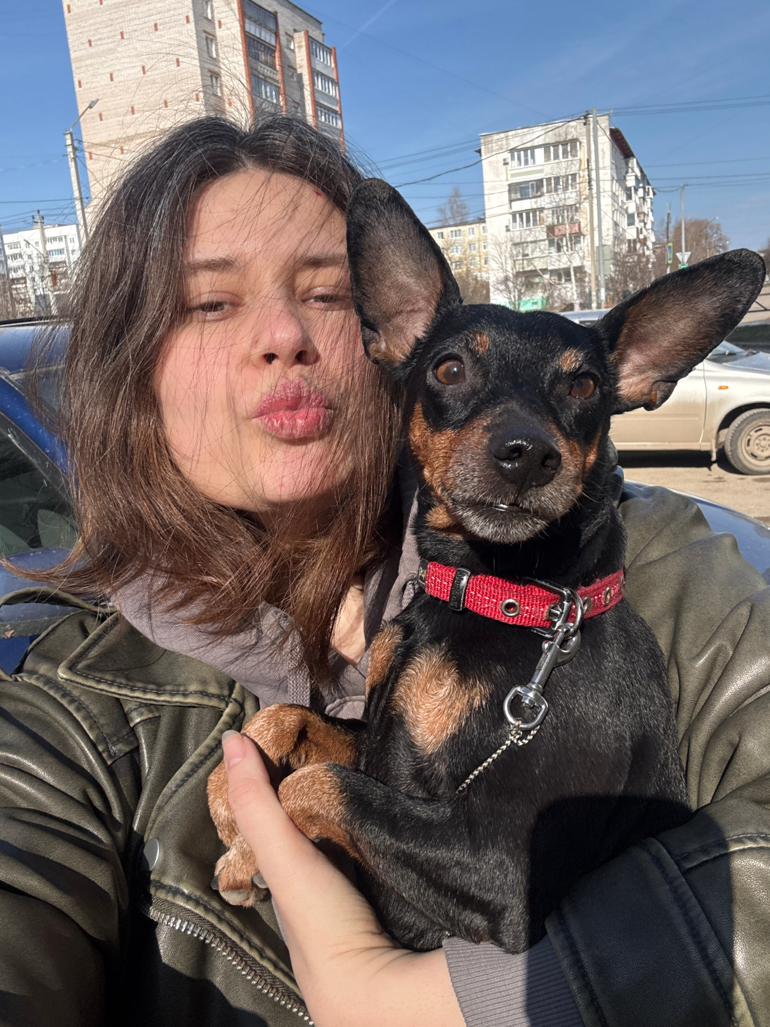 The image, taken in portrait orientation but displayed rotated 90 degrees clockwise, captures a young woman taking a selfie outdoors with her dog on a bright, sunny day. The woman, positioned on the l…read more