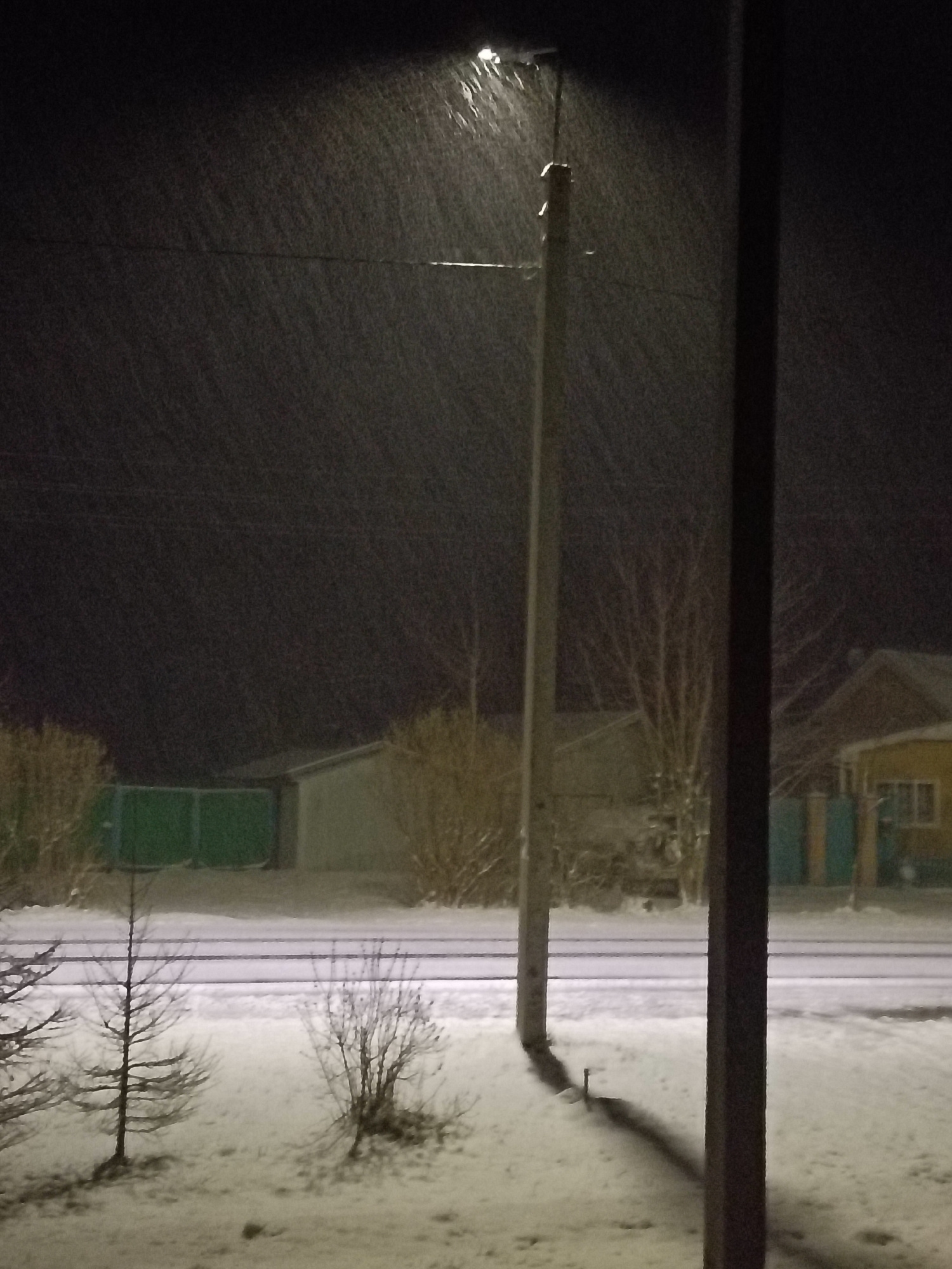 The image shows a snowy night scene in what appears to be a residential area of Красный Маяк, Russia. A street lamp illuminates the falling snow. In the background are several buildings, including a s…read more