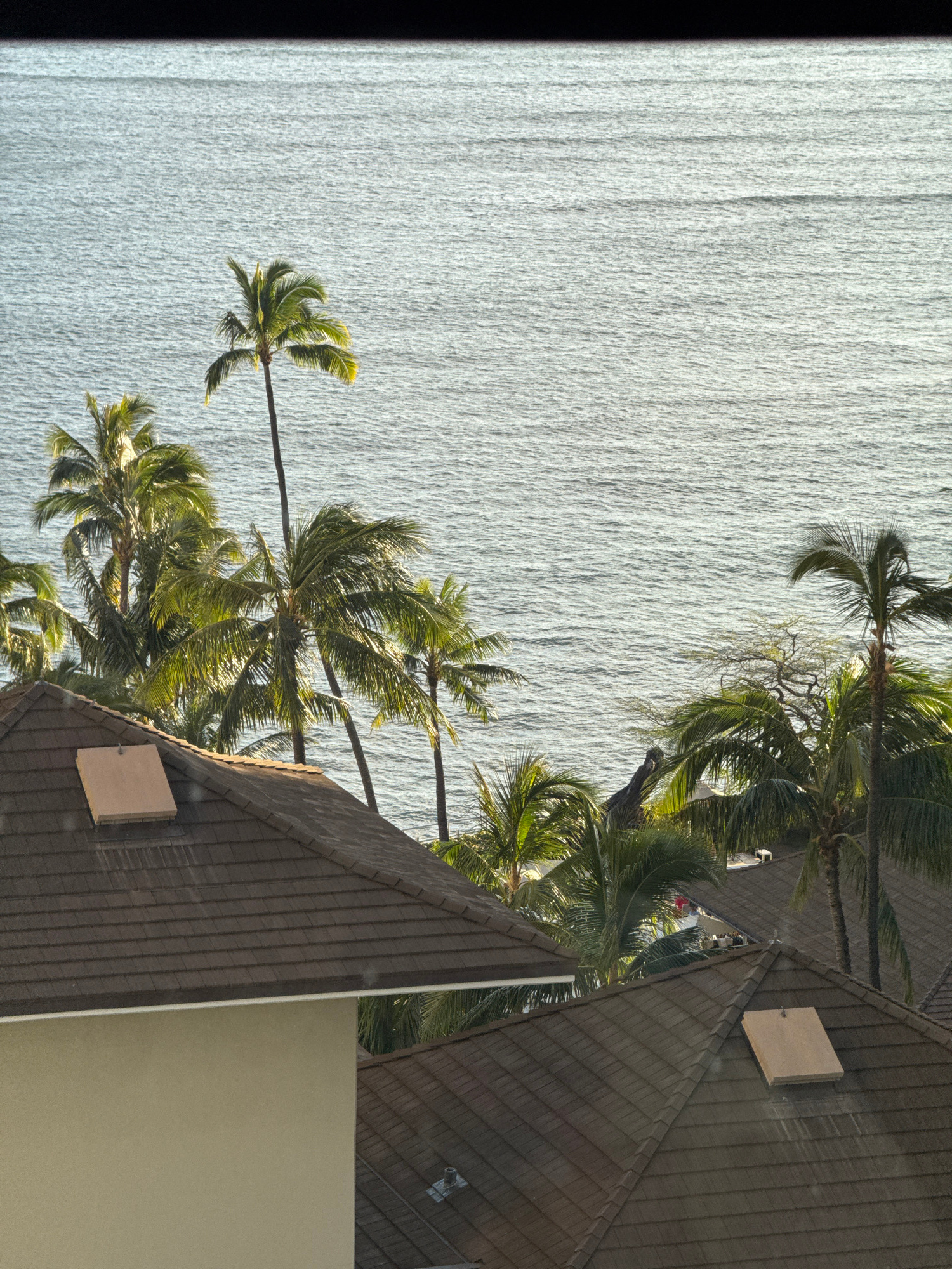 The photograph depicts a coastal scene, likely taken from an elevated position in Honolulu, United States of America. The foreground is dominated by the tiled roof of a building, with sections of adja…read more