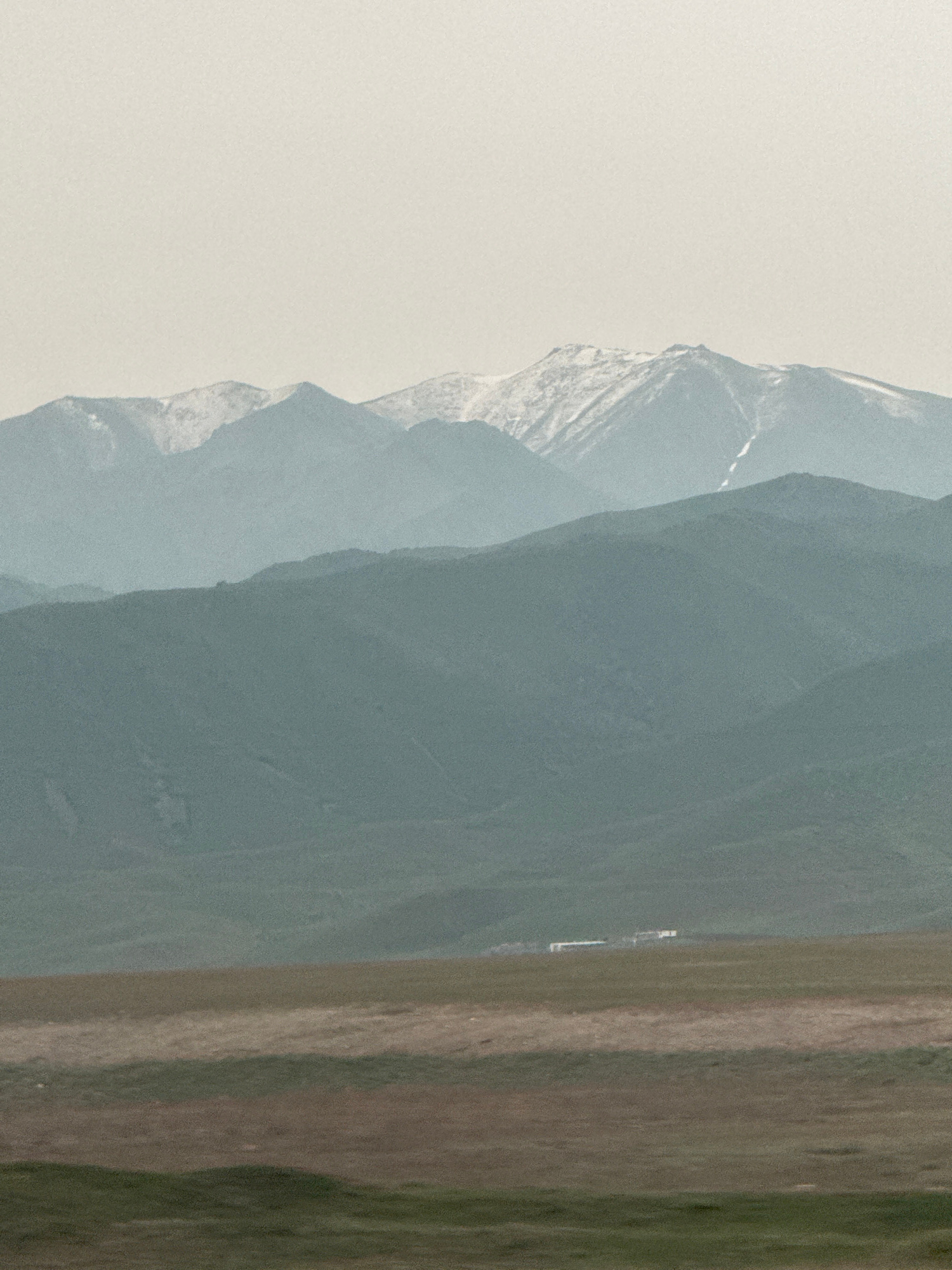 The image displays a vertical landscape scene with mountains on the left and a grassy field on the right. The mountains are rendered in shades of gray and blue, suggesting a hazy or overcast atmospher…read more