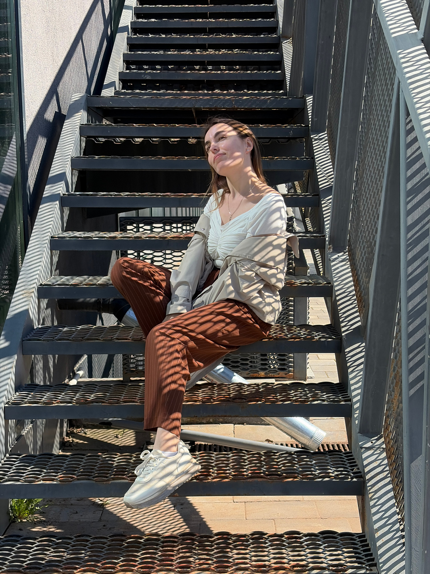A young woman is angled sideways across a metal railing structure outdoors. She is wearing brown striped pants, a white blouse, a light tan jacket, and white sneakers. The background includes a metal…read more