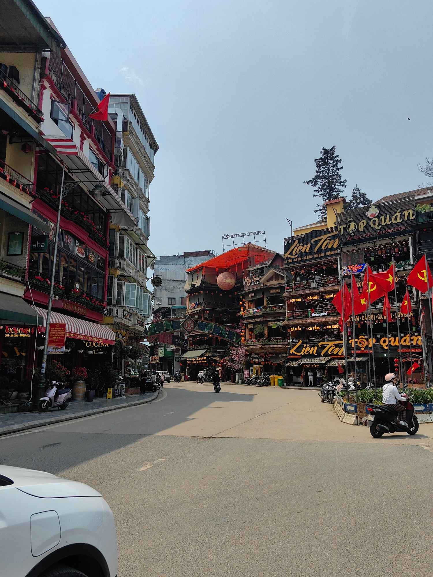The image depicts an urban street scene in Sa Pa, Vietnam, observed from a low-angle perspective. The foreground on the left shows the front right fender of a white passenger vehicle. The asphalt roadway, featuring faded white lane markings, occupies the central and lower portions of the frame. On the right, a dark-colored scooter is in motion, ridden by an individual wearing a white shirt and a light pink helmet, traveling away from the camera. The left side of the street is lined with multi-story commercial buildings. The nearest structure features red and white striped awnings over storefronts, balconies adorned with red flowers, and signs, including "CUCINA" and "aha cafe." A single red Vietnamese national flag hangs from an upper balcony of a building further down this side. The right side of the street is dominated by a multi-level commercial complex, identified by prominent signs for "Lien Ton" and "Top Quán." Numerous red Vietnamese national flags are displayed across the facade of this complex. The buildings feature multiple balconies, with patrons visible on some, and are decorated with numerous lanterns. A large red spherical object is positioned on a rooftop to the left of the "Lien Ton" sign, and a tall, slender evergreen tree stands atop the "Top Quán" building. Multiple scooters and motorcycles are parked along both sidewalks. In the mid-ground, another scooter is visible in motion, traveling away from the camera. The background consists of additional multi-story buildings under a clear, hazy blue sky. A single bird is observed flying in the upper right quadrant of the sky. The scene is illuminated by daylight, indicating active commercial operations. | Open Wire