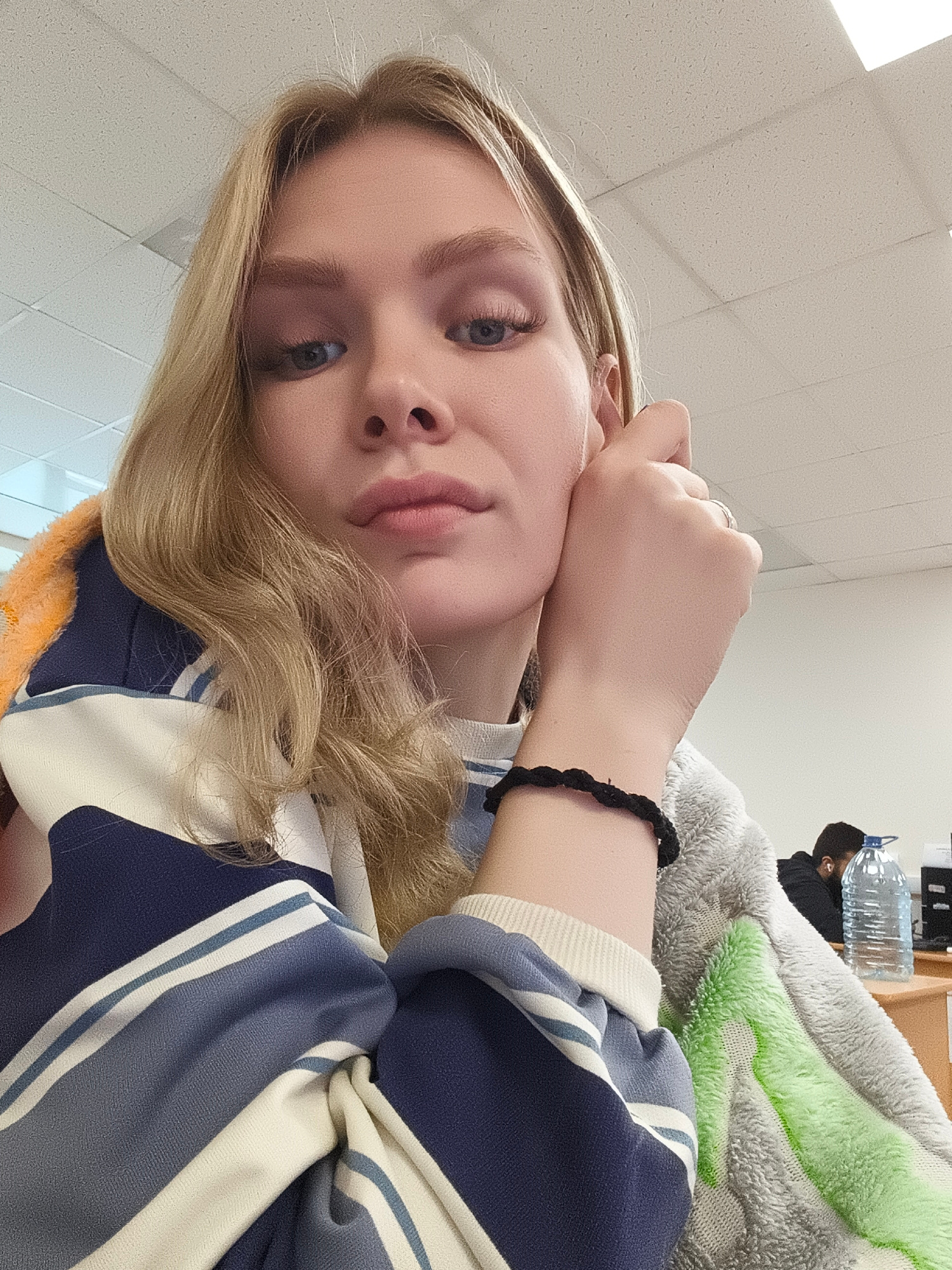 A medium-angle indoor shot presents a fair-skinned blonde woman with her face angled slightly downward. Her left hand is raised to her face, fingers touching her ear. A dark bracelet encircles her wri…read more
