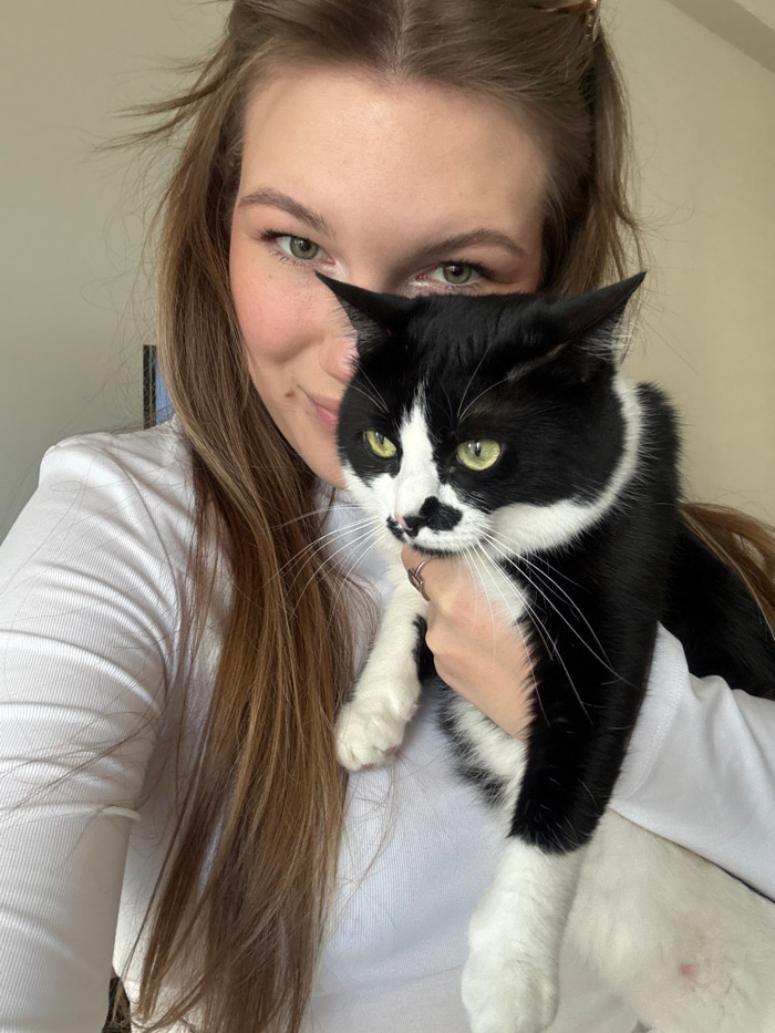 A portrait-oriented image shows a young adult female holding a black and white tuxedo cat in an indoor setting in Belgrade, Serbia. The female, positioned on the left and upper frame, has long, light…read more