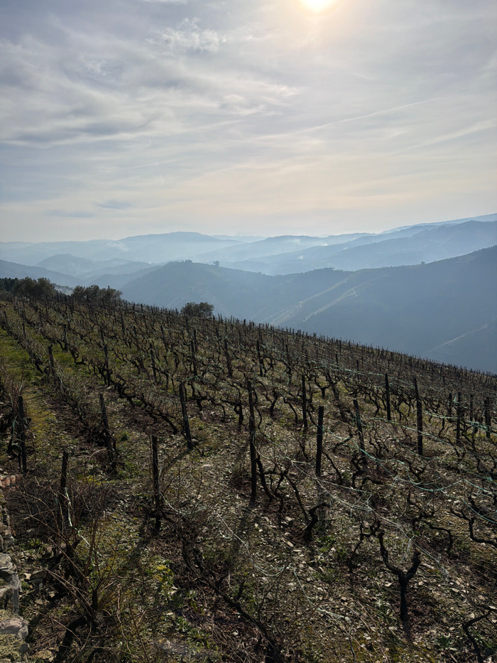 A vineyard covers a hillside, its rows of bare vines stretching into the distance. Beyond, misty mountains fade into the horizon, their peaks layered in shades of blue. To the left, a pale sky filled…read more